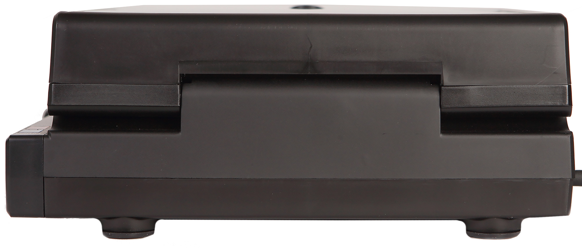Задняя часть гриля не позволяет сделать вывод, возможна ли регулировка расстояния между панелями под высоту помещенных на них продуктов. Однако мы — крайне скрупулезные, а временами даже вредные обозреватели, которые не только осматривают, но крутят-вертят и дергают прибор за разные части. Мы попытались приподнять заднюю часть крышки при зафиксированном и свободном размещении крышки. В первом положении крышка в месте соединения с корпусом ровно приподнимается буквально на 2 мм. Если крышка не зафиксирована, а просто прикрыта, то ее задняя часть начинает «болтаться» вправо или влево, приподнимаясь при этом почти на сантиметр. Значит, верхняя часть гриля крепится не намертво, что позволит некритично сдавливать и поджаривать продукты большей, чем расстояние между сомкнутыми панелями, высоты. В любом случае, точно оценить данный момент эксплуатации мы сможем только в ходе практических экспериментов.