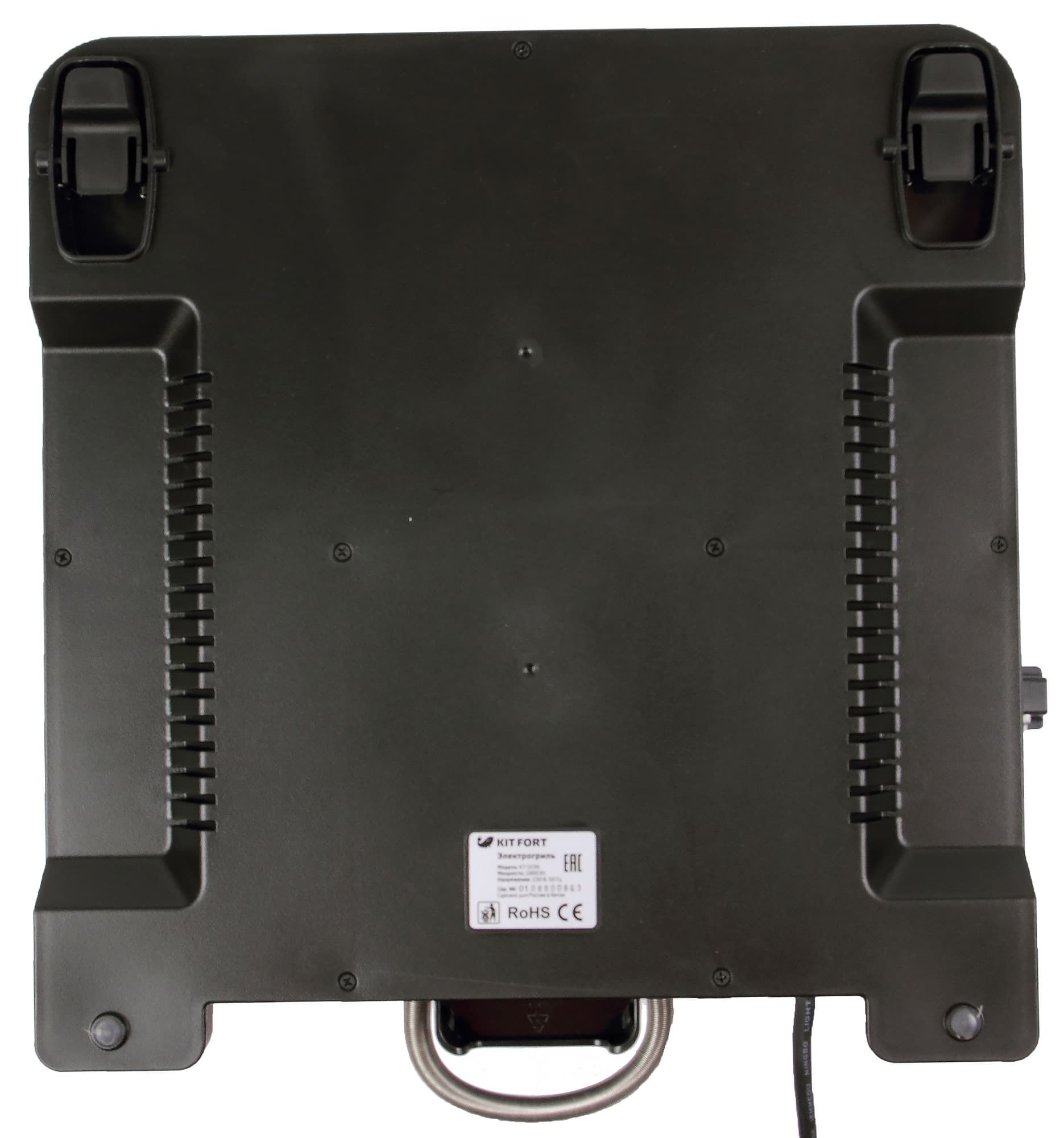 Со стороны дна находятся два ряда вентиляционных отверстий, наклейка с информацией о приборе и ножки. На задних небольших ножках закреплены резиновые накладки, противодействующие скольжению. Передние ножки оснащены регуляторами высоты передней части гриля. Так, гриль может находиться в двух положениях: четко горизонтальном и таком, когда передняя часть приподнимается на 1 см, что облегчает слив выделяющегося из продуктов жира и влаги в расположенный в задней части контейнер.