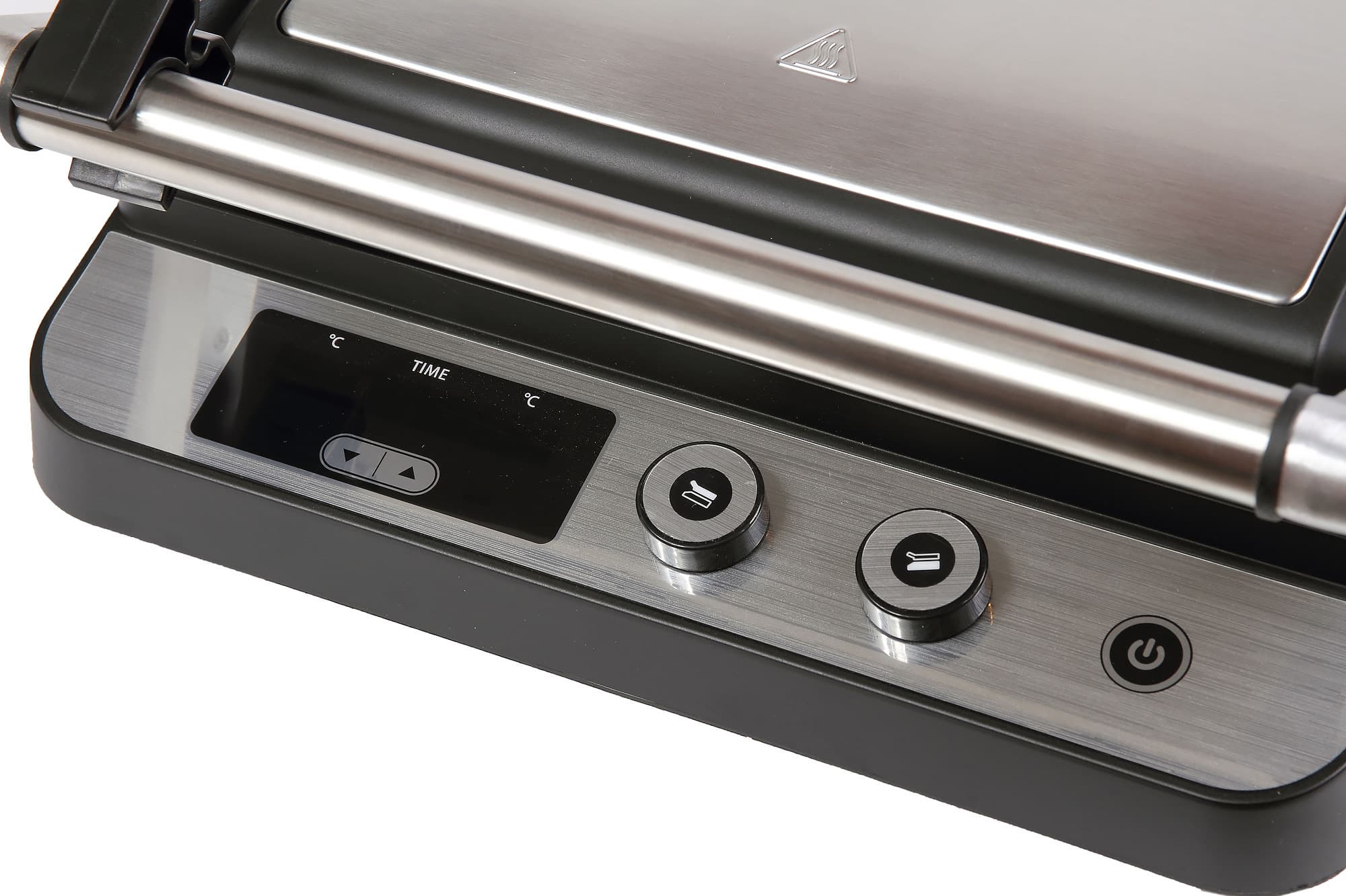 Изготовлен корпус гриля из пластика черного цвета и металла. Панель управления, представленная двумя регуляторами, кнопкой включения и дисплеем с двумя сенсорными кнопками, расположена в передней части прибора. Массивная горизонтальная ручка находится на расстоянии от жарочных панелей, что позволит ей не нагреваться в ходе работы. На поверхности стола или стеклокерамической плиты прибор стоит устойчиво и без излишнего скольжения.