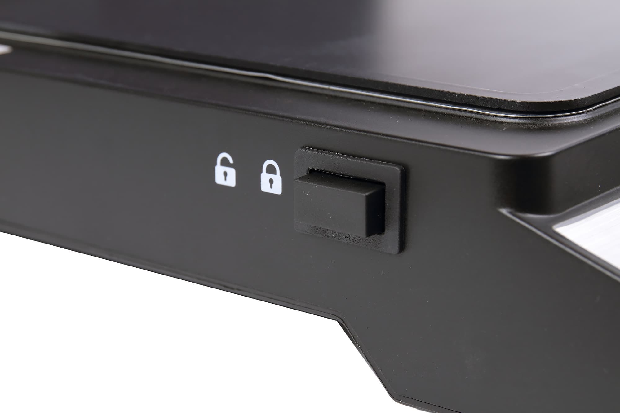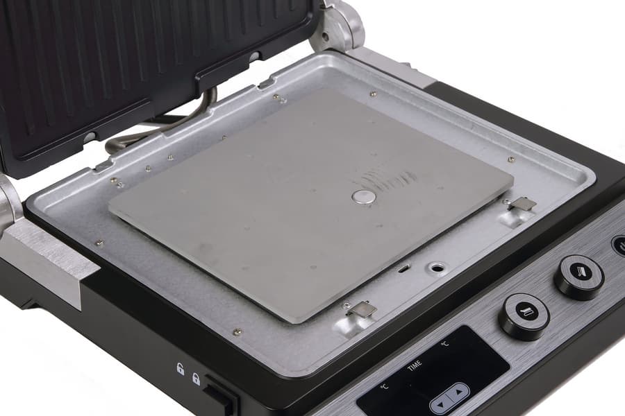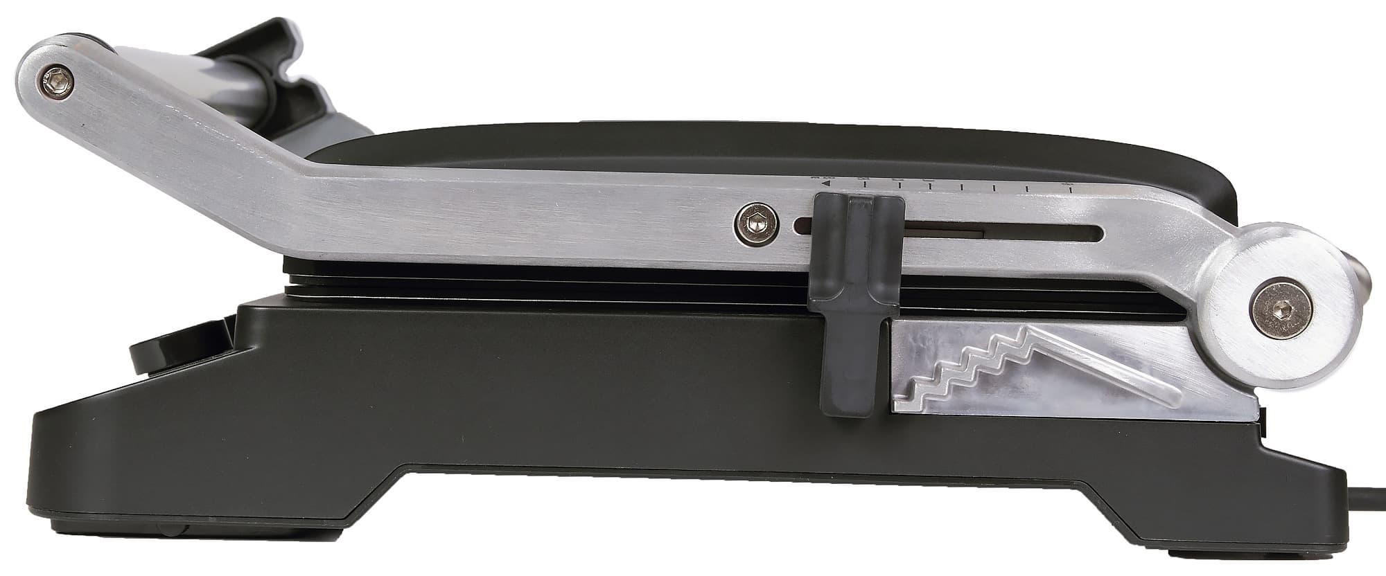 Верхняя откидная часть закреплена на ручке гриля с помощью шарниров. Благодаря этому крышка гриля свободно колеблется по небольшой амплитуде вверх/вниз и автоматически подстраивается под высоту продуктов. Также панель может быть закреплена в строго горизонтальном положении — на левой боковой стороне имеется специальный фиксатор. Это немаловажный аспект, который оказывает влияние как при бесконтактной, так и при контактной жарке продуктов. Сырье не сдавливается, не деформируется и прожаривается равномерно по всему объему, потому что верхняя панель всегда располагается горизонтально, а не под углом.