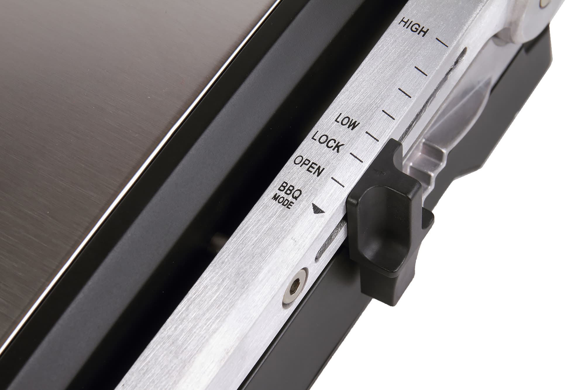 На ручке закреплен, но легко может быть снят, упор. Данная деталь нужна при использовании гриля в качестве жаровни, т. е. в раскрытом виде. Откидывается верхняя панель на 180° при переводе фиксатора крышки в положение BBQ mode.