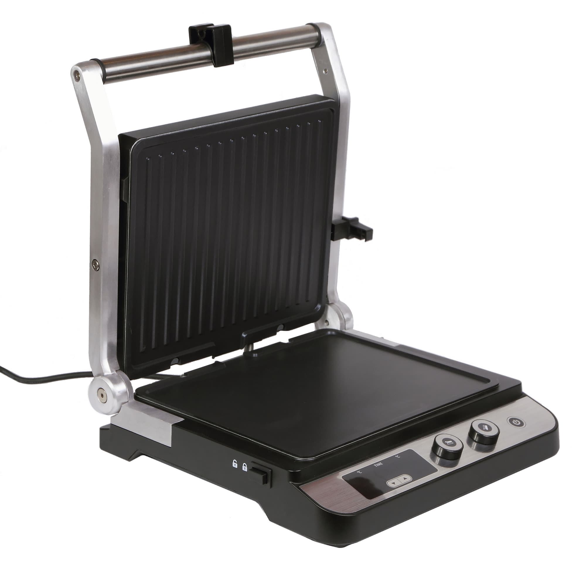 При подключении гриля к электросети раздается длительный звуковой сигнал и на дисплее на короткое время загораются и гаснут цифры. Индикатор на кнопке включения начинает мигать — гриль находится в спящем режиме. После нажатия на кнопку включения/выключения на дисплее загораются нули — прибор перешел в режим ожидания. В этом режиме нажатие на регулятор соответствующей панели включает ее нагрев. Температура задается вращением регулятора по часовой стрелке для увеличения и против часовой стрелки для уменьшения показателя. Шаг регулировки — 10 °C. Установленный показатель отображается на дисплее. Под цифрами, отображающими температуру, находятся два индикатора. Во время нагрева индикатор имеет красный цвет, после выхода на рабочую температуру цвет меняется на зеленый. Таймер времени приготовления активируется нажатием на кнопки «+» и «−». Время устанавливается в промежутке от 1 до 99 минут. Обратный отсчет продолжительности начинается сразу же после настройки времени. Отсчет на последней минуте идет по секундам, до этого на табло можно увидеть время, оставшееся до окончания процесса жарки, в минутах.