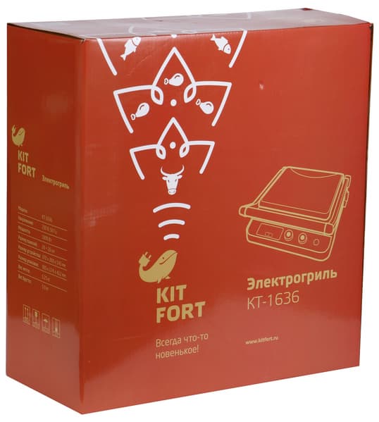 Прибор поступает в магазины в картонной коробке-параллелепипеде терракотового цвета. Коробка оформлена в узнаваемом стиле Kitfort: схематическое изображение прибора, его название и модель, логотип и слоган на фронтальной стороне, технические характеристики и описание прибора — на боковых. Ручкой для переноски упаковка не оснащена.