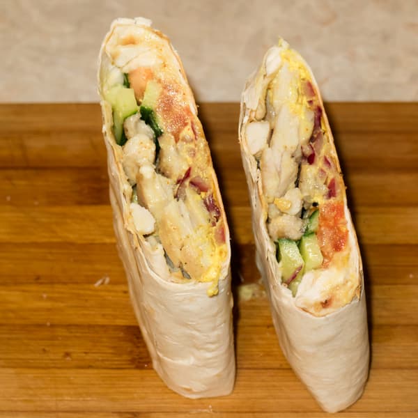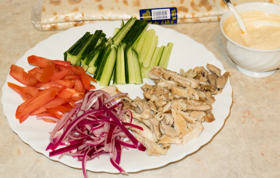Примерно через 7-8 минут филе было полностью готово, а на его поверхности даже образовалась поджаренная корочка. Подготовили овощи, остудили и нарезали курицу и смешали соус на основе сметаны. Свернули шаверму — уложили на кусок тонкого лаваша нарезанное куриное филе, овощи, полили соусом и свернули в форме брусочка.