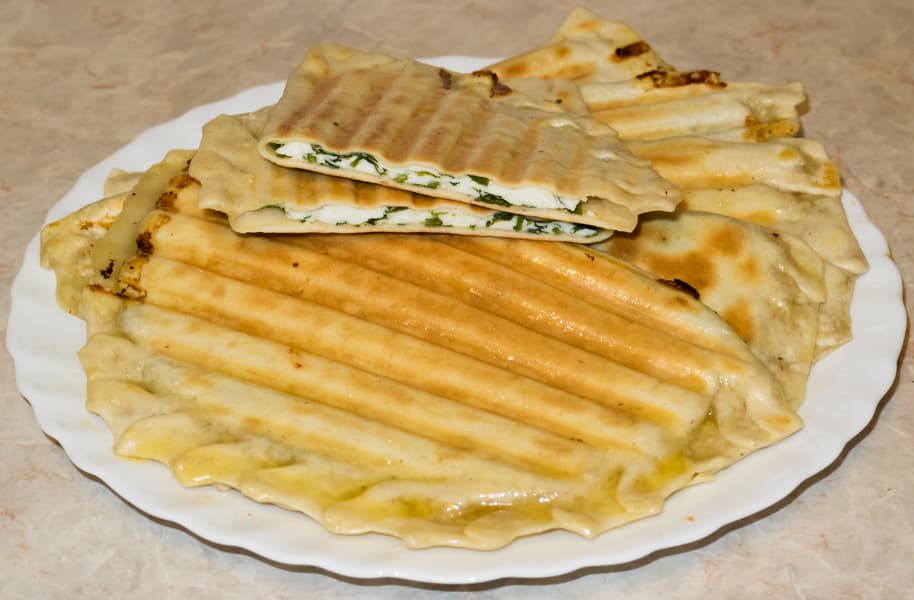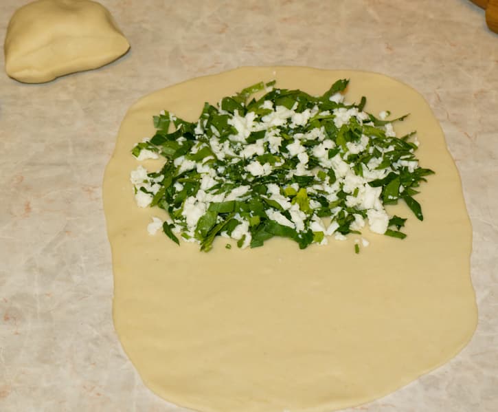 Для начинки — адыгейский сыр (сулугуни, брынза), любая зелень (петрушка, шпинат, зеленый лук и т. д.).