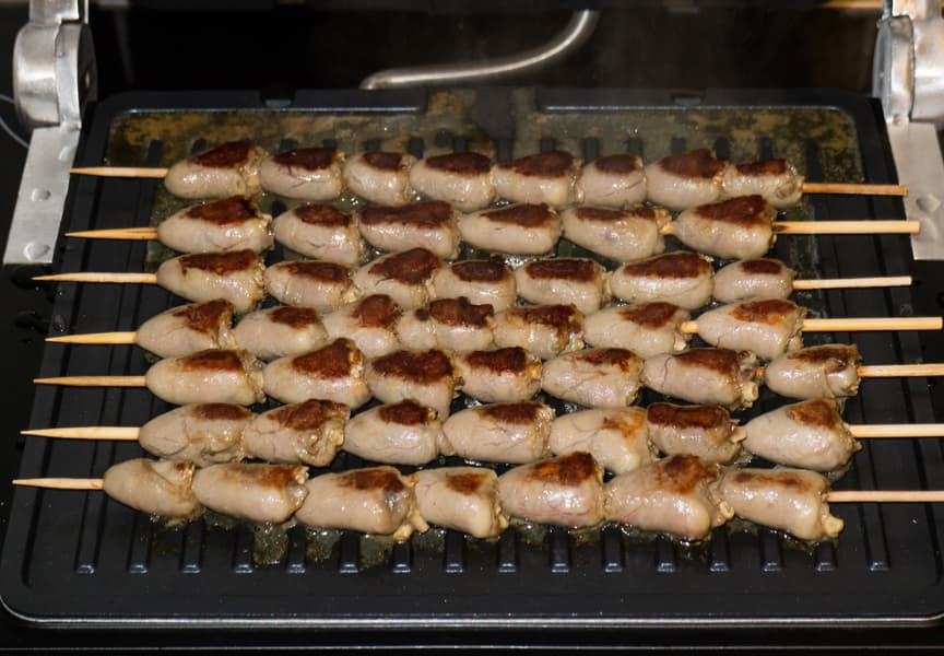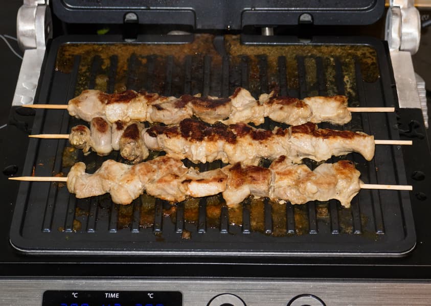 Начали процесс с 230 °C. Через пять минут увидели, что поверхность шашлычков уже запеклась, поэтому уменьшили температуру до 200 °C. Сердечки жарились 12 минут.