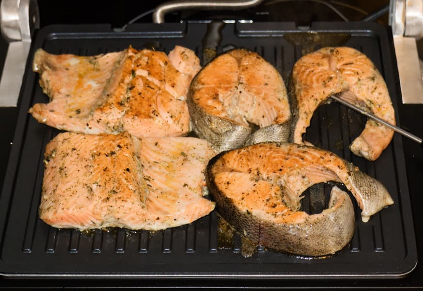 Обратите внимание, что в гриль были выложены куски рыбы разной толщины. При этом поверхность всех кусочков, даже тех, части которых не касались верхней рабочей панели, подрумянены.
