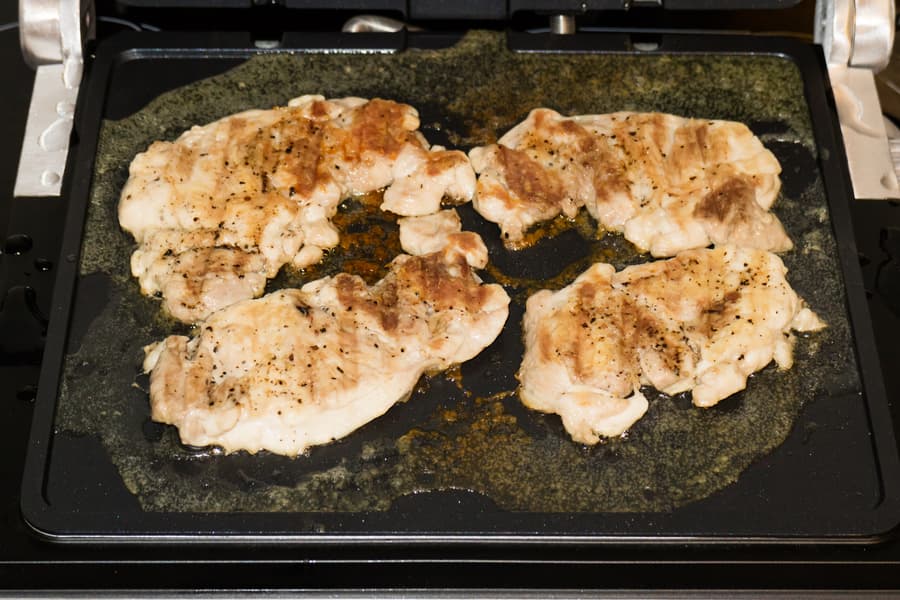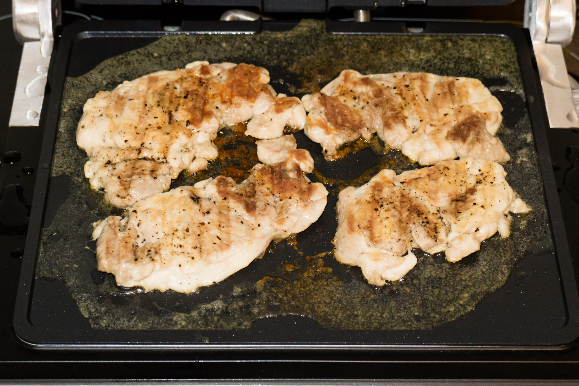 Нагрели гриль до 200 °C. Сразу после того, как загорелся зеленый индикатор готовности к работе, выложили бедра на панель. Тут нас ждало первое разочарование — бедра даже не зашипели. Удивились, но закрыли крышку гриля. Тут же возобновился нагрев нижней панели, а через несколько секунд — и верхней. Несмотря на это, увеличили температуру до максимальных 230 °C.