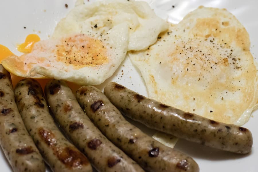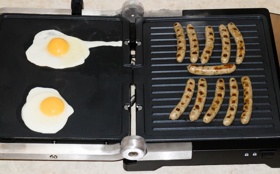 Установили гриль в раскрытом виде. Т. к. натуральным колбаскам потребуется больше времени для приготовления, чем яйцам, сначала разогрели только одну панель — рифленую до 230 °C. Когда колбаски поджарились с одной стороны, перевернули их и включили нагрев второй, плоской панели. Жарку яичницы решили начать с максимальной температуры. Аккуратно и медленно, чтобы белок не растекся по всей поверхности панели, выложили яйца и уменьшили температуру до 200 °C. Когда белок «схватился», перевернули яйца и слегка поджарили с другой стороны. К этому времени подоспели и колбаски.