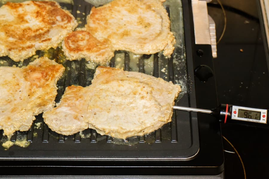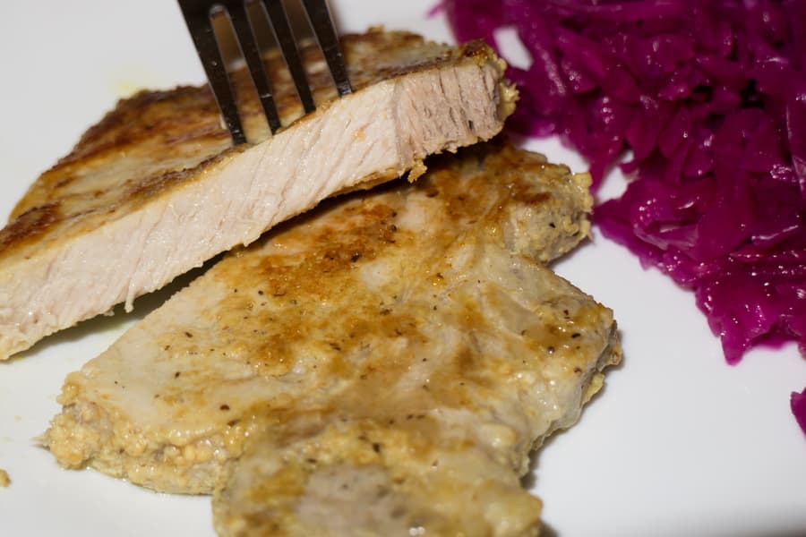 Свиной карбонад был нарезан на ломти толщиной 1,5 см и замаринован на ночь в смеси соли, горчицы и растительного масла. Жарили, разогрев гриль до 220 °C, семь минут. За это время, несмотря на выделившуюся на панель влагу, кусочки мяса поджарились. Температура свинины внутри куска достигла 96 °C.