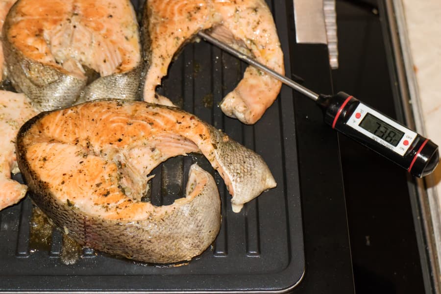 Рыбу, присыпанную солью, свежемолотым перцем, зеленью и легко смазанную растительным маслом, жарили на 210 °C примерно пять с половиной минут. Остановили приготовление, когда температура внутри куска достигла 70,9 °C. Однако температура продолжала расти до тех пор, пока кусок рыбы не был перенесен на тарелку.