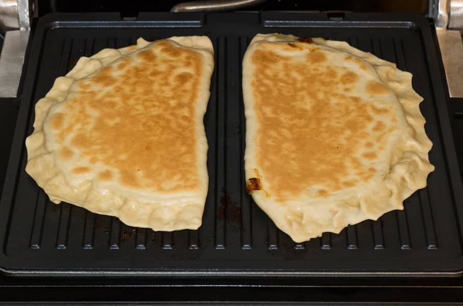 Для жарки кутабов разогрели гриль до максимальных 230 °C. Если закрыть крышку, то она попросту придавит достаточно нежные лепешки. Они деформируются, и начинка может вытечь. Поэтому обжарку производили, установив крышку на первом уровне фиксатора. Крышка касалась верхней части лепешки, но не давила на нее.