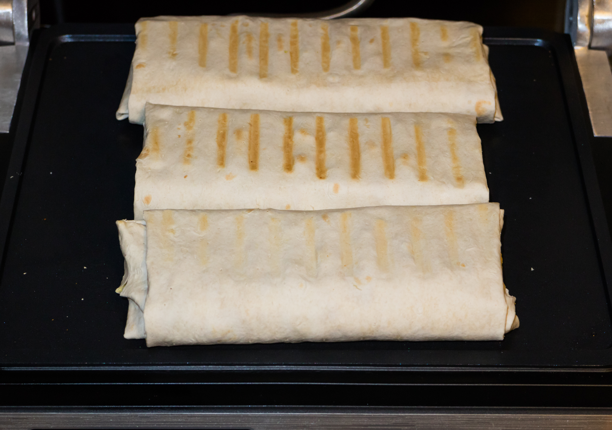 Разогрели гриль до 220 °C, уложили три готовые шавермы, прижали крышкой, так, чтобы гриль работал в контактном режиме, и установили на таймере 6 минут.