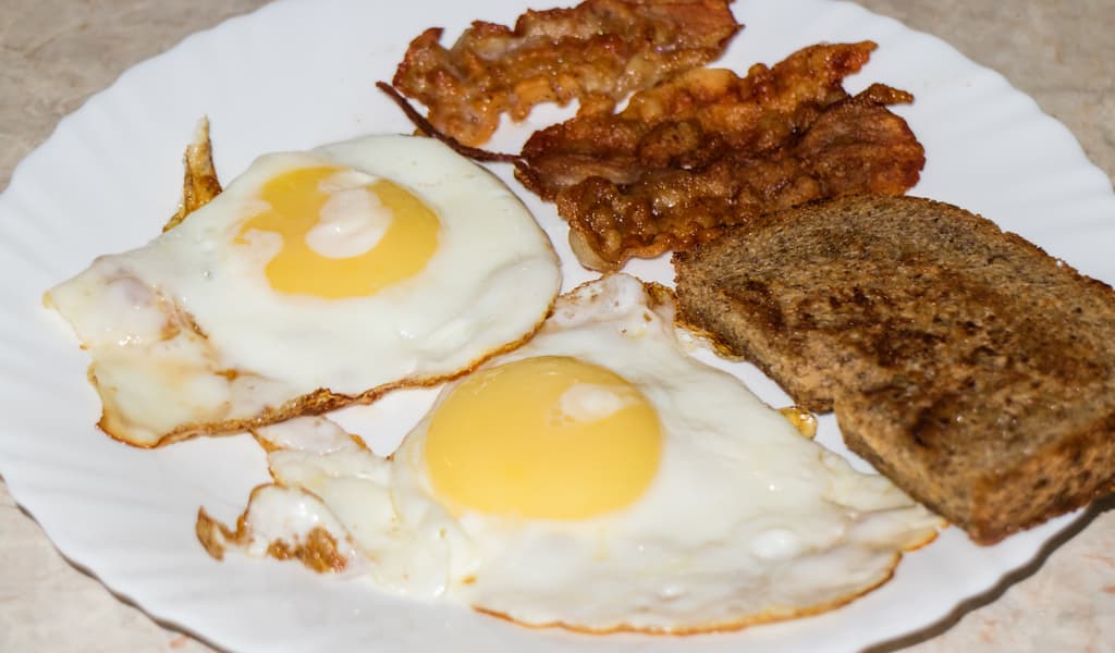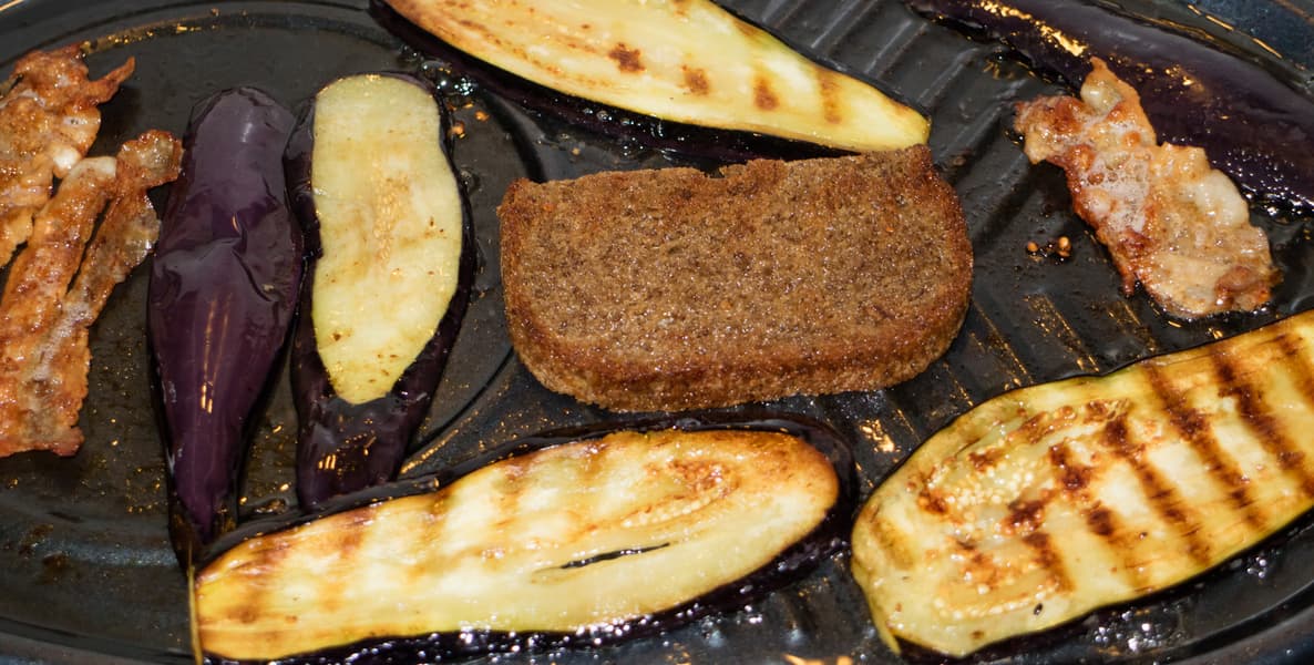 На ней поджарили бекон, хлеб, баклажаны и пару яиц.