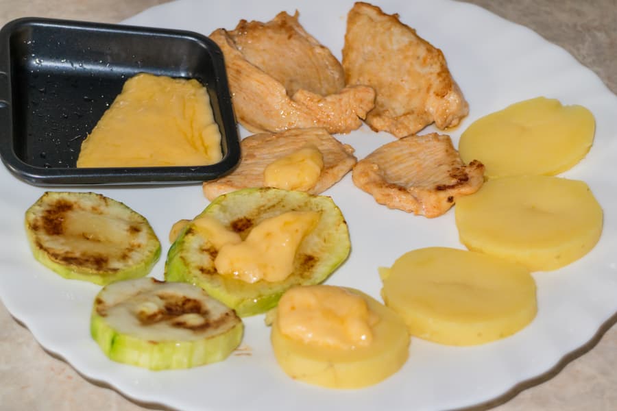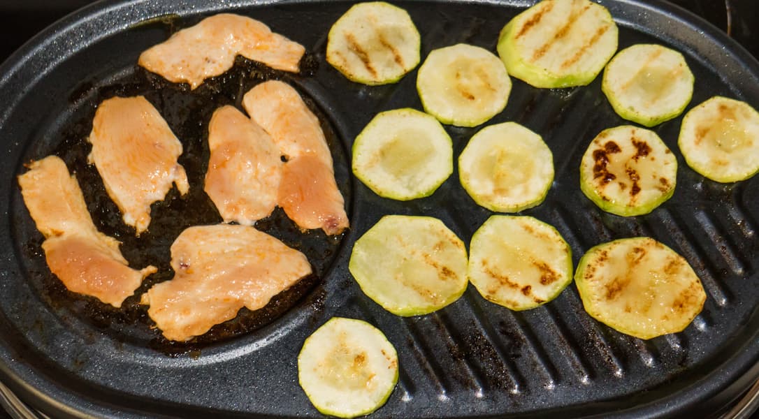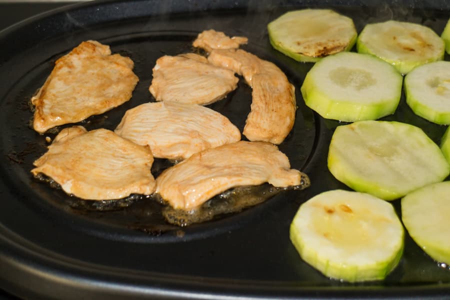 Жарили курицу и кабачки на панели-гриль. Обжарка одной стороны занимала около двух-трех минут.