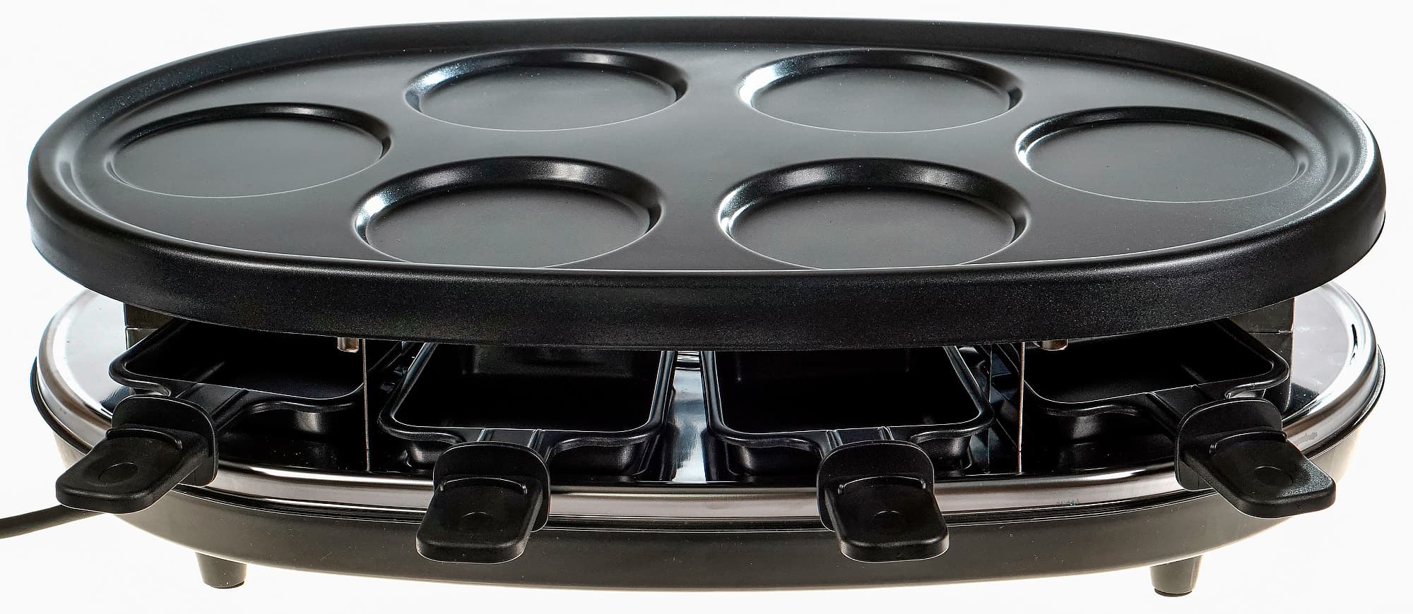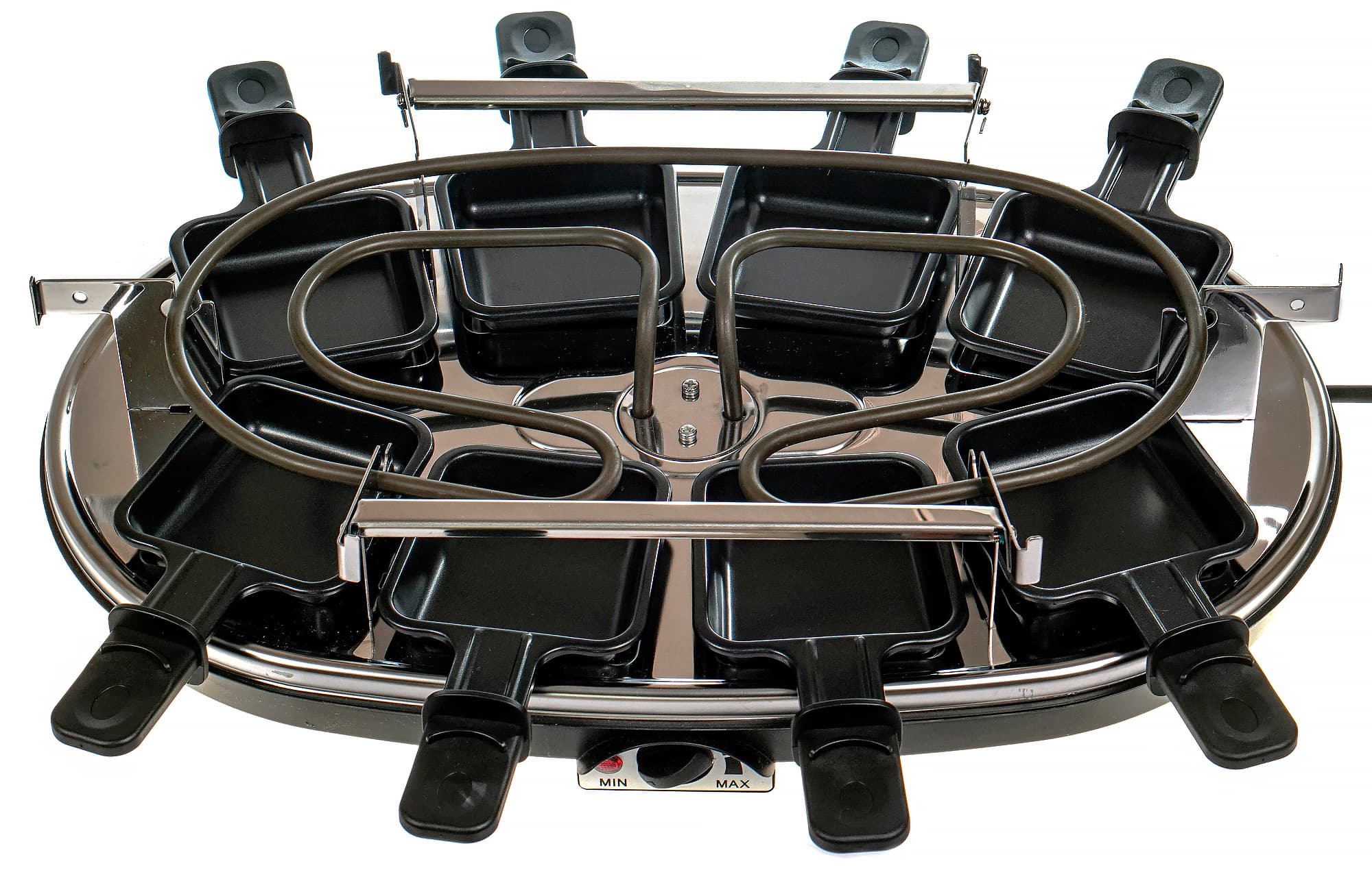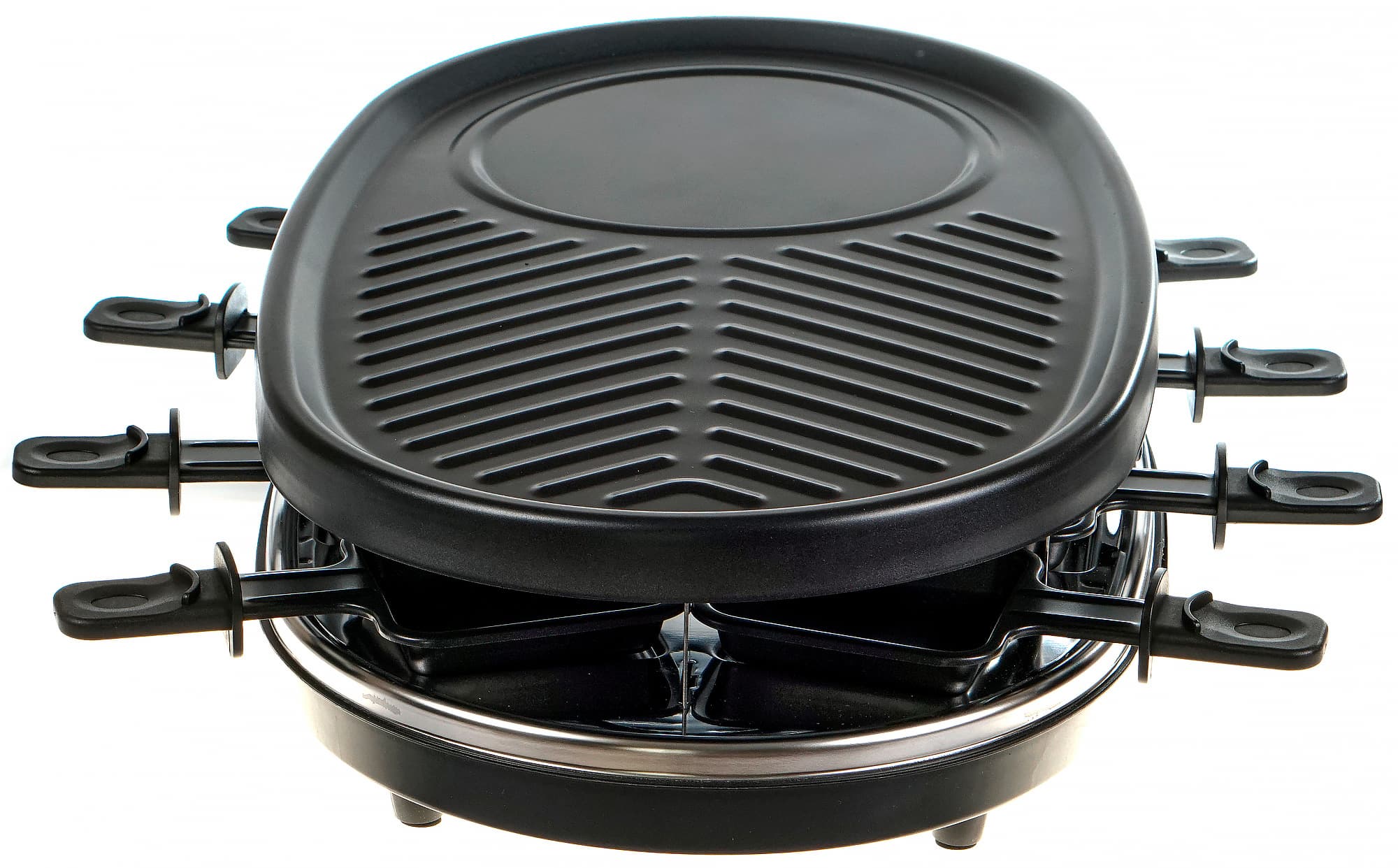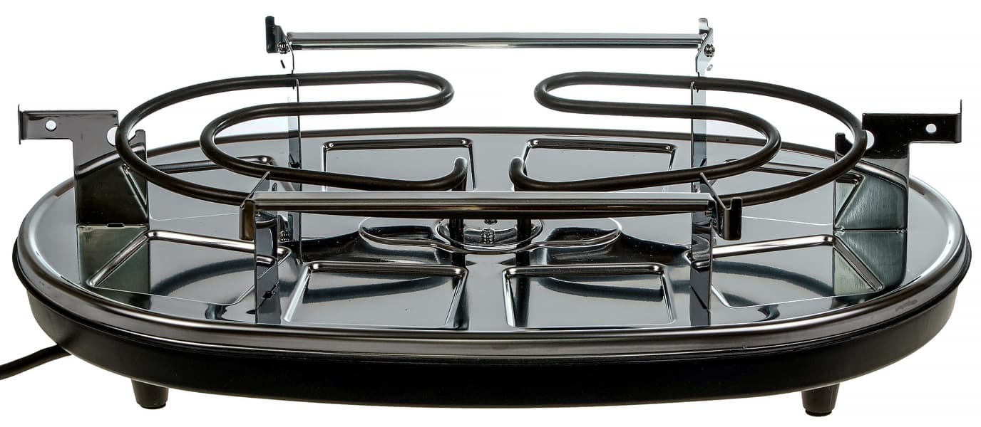 Конструкция раклетницы довольно проста: основание, на котором расположены места для размещения порционных сковородочек, тэн и элементы управления.
