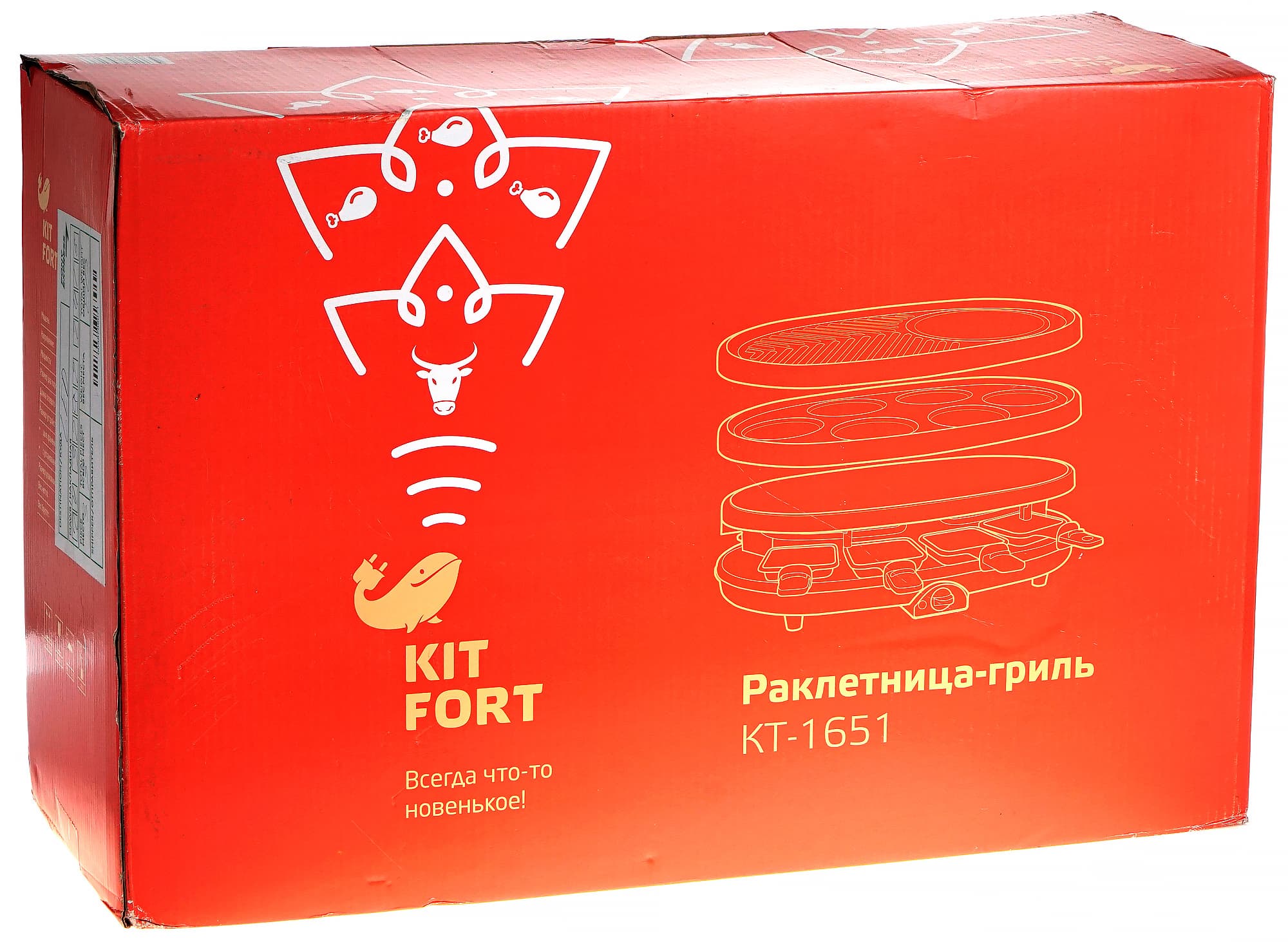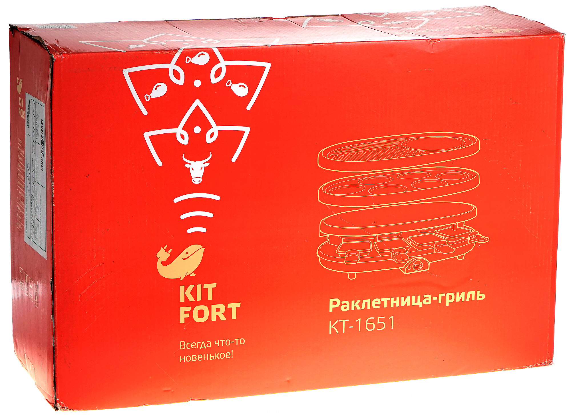 Раклетница-гриль упакована в одноцветную картонную коробку, оформленную в фирменном стиле Kitfort. На упаковке размещены сведения о приборе и его технических характеристиках. Схематическое изображение позволит составить первое впечатление о внешнем виде устройства. Ручкой для переноски упаковка не оснащена.