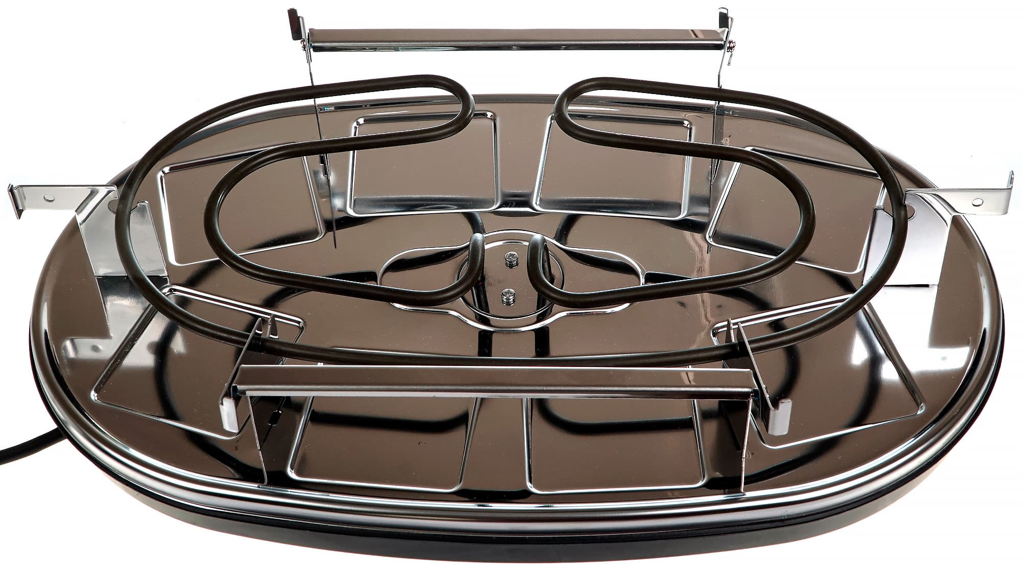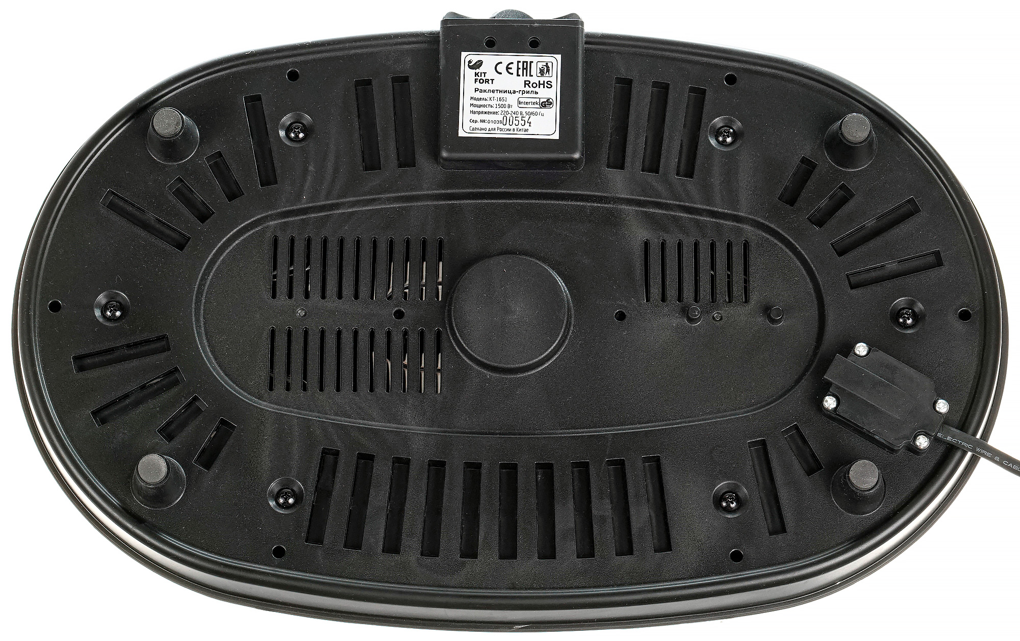 Со стороны дна основания можно увидеть четыре высокие ножки (чуть менее трех сантиметров), множество вентиляционных отверстий и наклейку с краткой технической информацией о приборе. Ножки оснащены резиновыми накладками, противодействующими скольжению. Кабель электропитания соединен с корпусом сбоку. На первый взгляд длина шнура кажется достаточной. Затем приходят мысли о гостях вокруг стола и вопросы о том, как же будет установлен этот стол, и есть ли неподалеку розетка. Тестирование показало, что никаких проблем с размещением раклетницы на столе не возникает.