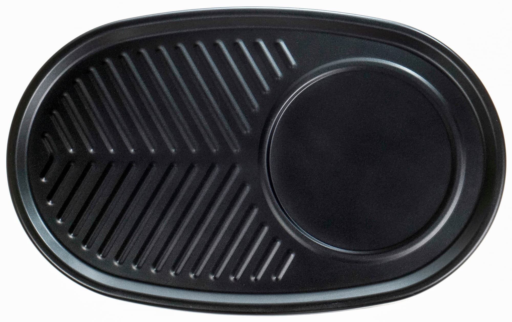 Вторая панель разделена на две части. В углублении диаметром 16 см можно жарить тонкие блины или яичницу-глазунью, а рифленую часть использовать в качестве гриля. Глубина панели около 1 см.