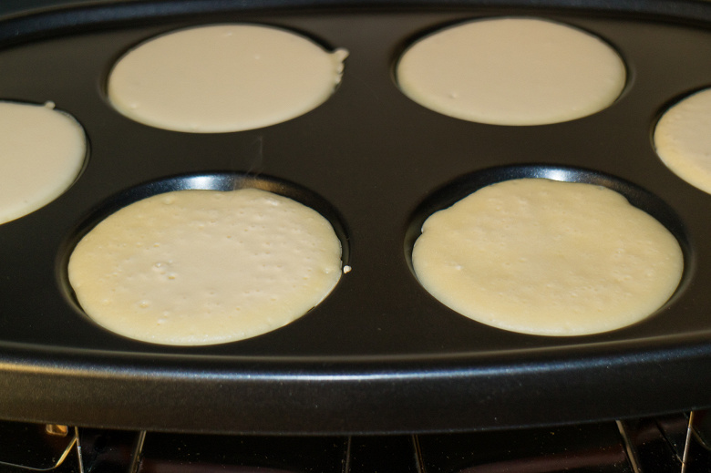 Ручку нагрева выкрутили до максимума и стали ждать, когда же погаснет индикатор. Спустя некоторое время стало ясно, что гаснуть индикатор не собирается, а тэн греется без перерывов. Тогда стали выкладывать в углубления примерно по паре ложек теста. Поскольку тесто жидкое, оно прекрасно растекалось, полностью заполняя форму.