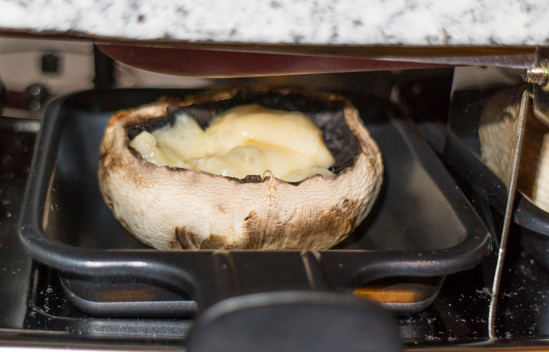 Шампиньоны очистили, вытащили ножки. Так как грибы нам попались титанических размеров, уложили в каждую сковородку по одному. Разместили сковородки на нижнем ярусе. Минут через десять, когда грибы немного запеклись, слили выделившуюся и скопившуюся в шляпках влагу и положили внутрь немного мелко нарезанной колбасы и сыра.