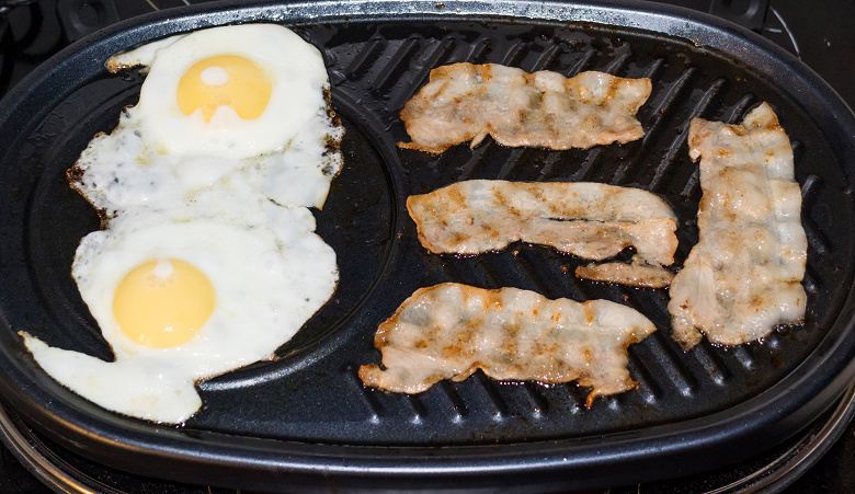 Мы использовали крупные яйца категории С0. Думаем, что яйца категории С1 идеально заполнят форму. Впрочем, и в нашем случае все прекрасно получилось, и яйца не перелились за границы углубления. Единственная рекомендация по итогам теста — хорошенько смазать поверхность панели маслом. Мы вообще не смазывали, решив, что вполне хватит вытопившегося из кусочков колбасы жира, поэтому перевернуть яйца нам не удалось — колбаса оказалась не столь уж жирной.