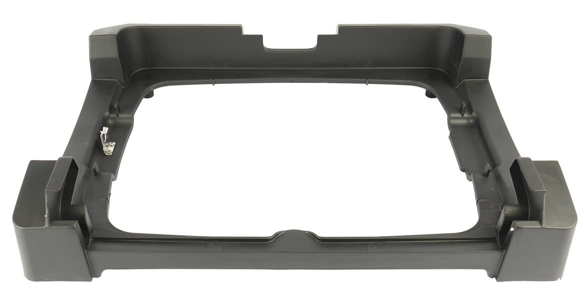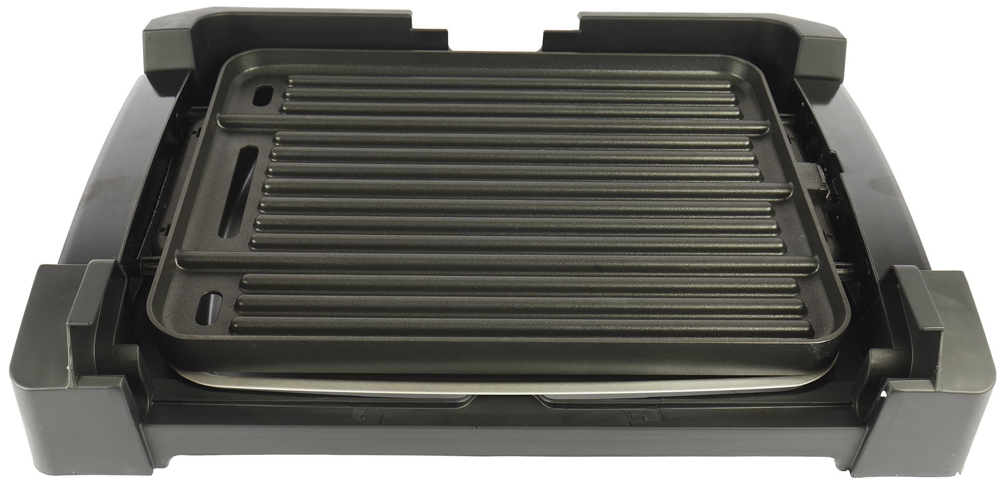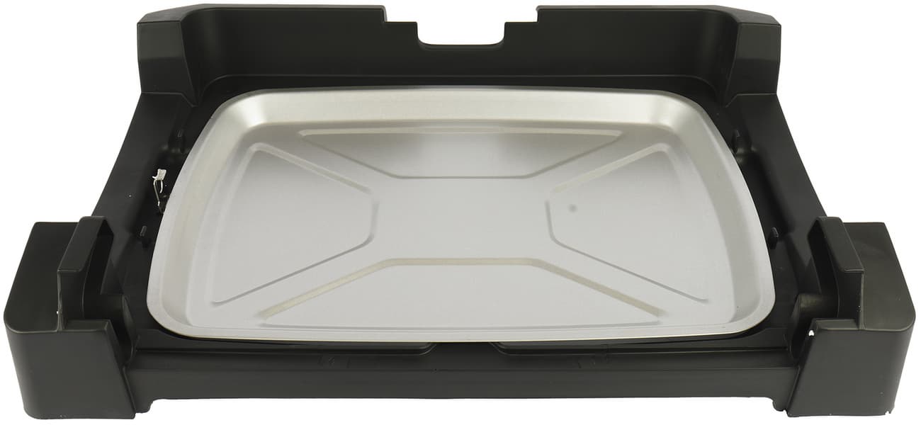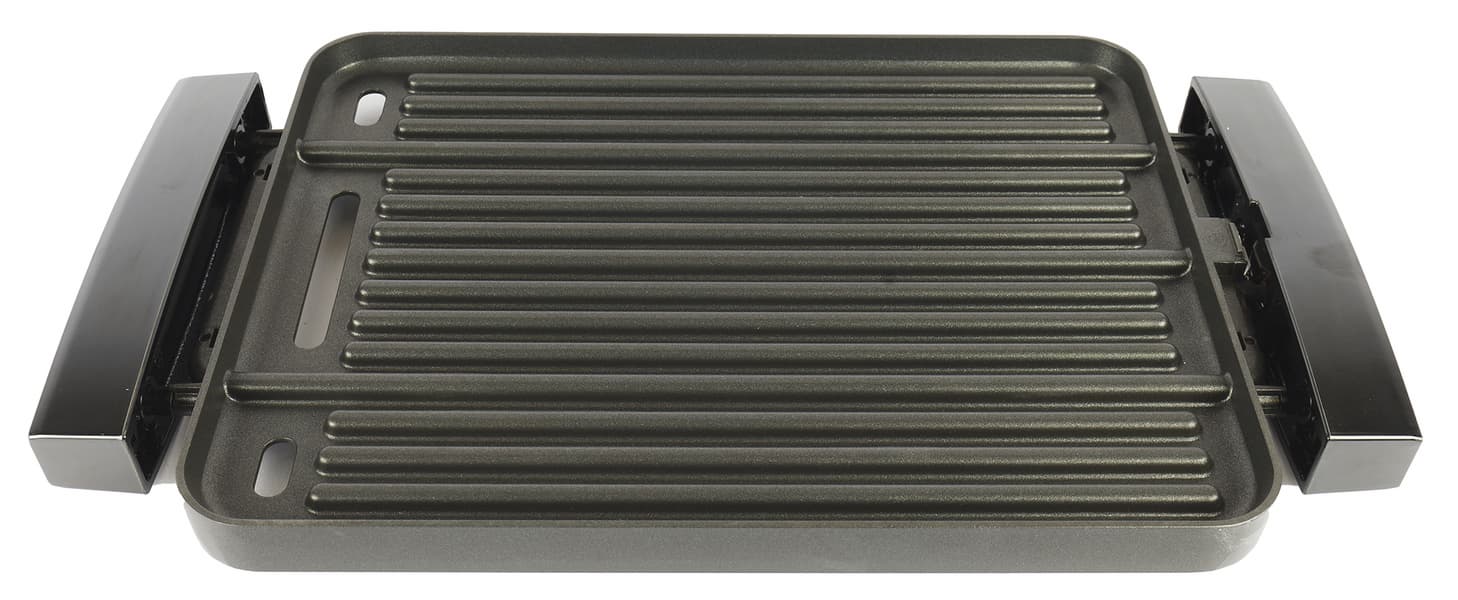 Панель с антипригарным покрытием двусторонняя. С одной стороны — ребристая, с другой — гладкая. Размер панели — 388×288 мм, с несъемными ручками длина доходит до 390. Во время жарки лишний жир и сок с готовящихся продуктов через специальные отверстия в панели стекают в поддон.