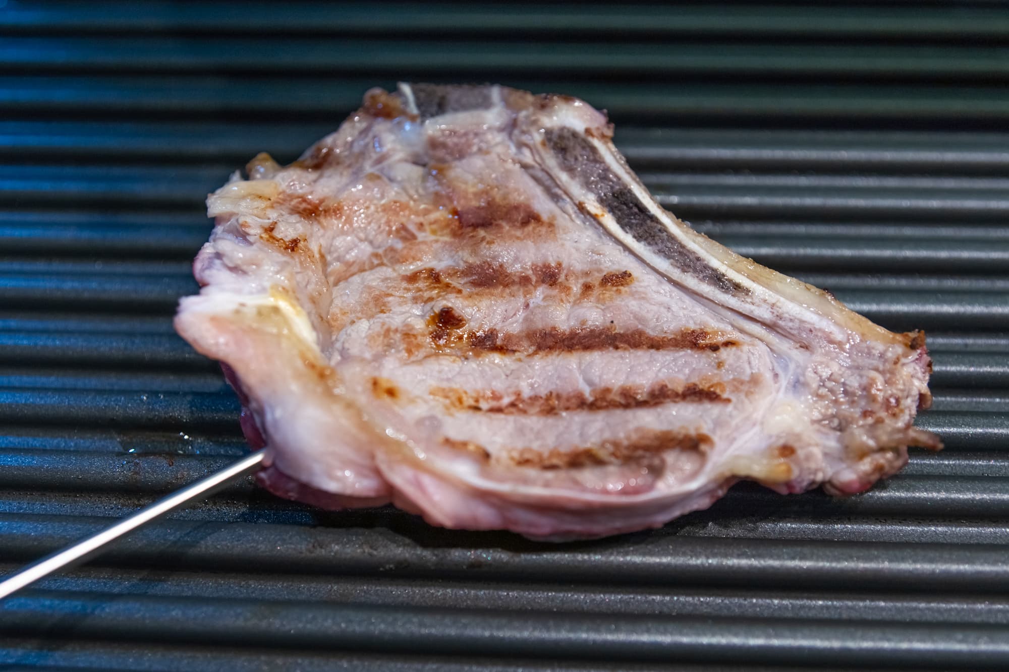 Для этого теста мы использовали кусок говядины из спинной части туши — тонкий край. Мясо комнатной температуры посолили и слегка натерли растительным маслом. Разогрели гриль до максимума и, воткнув в середину куска термощуп, выложили будущий стейк на ребристую поверхность панели.