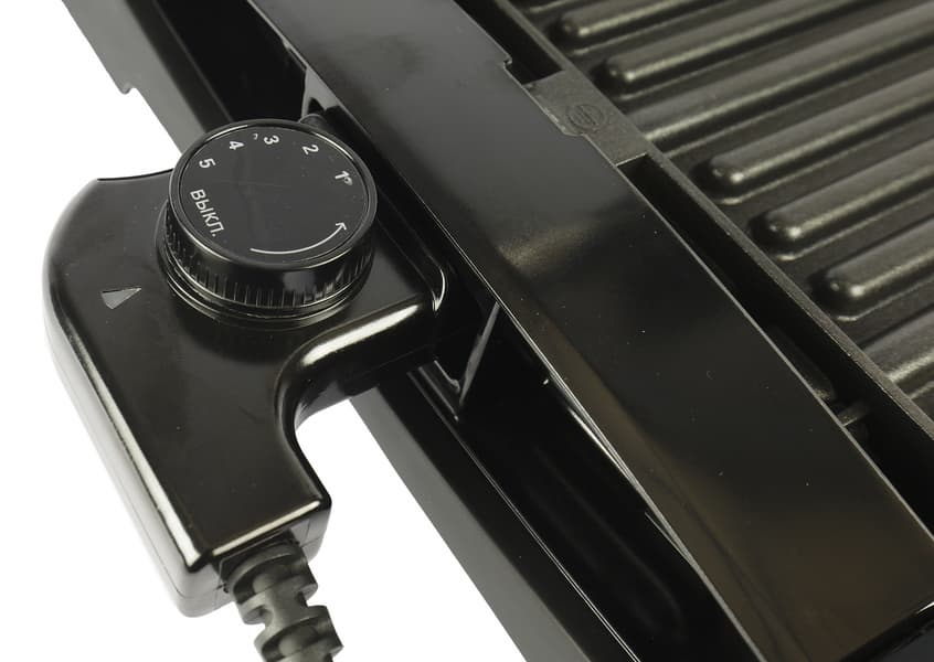 Электрический гриль Kitfort KT-1673 управляется поворотной ручкой термостата. В устройстве предусмотрено 5 уровней нагрева в диапазоне от 140 до 220 градусов.