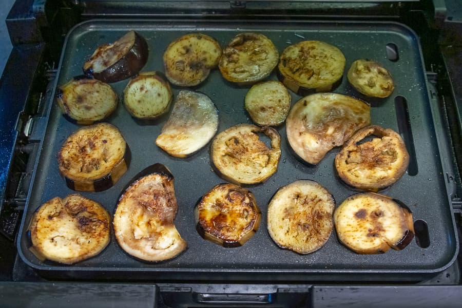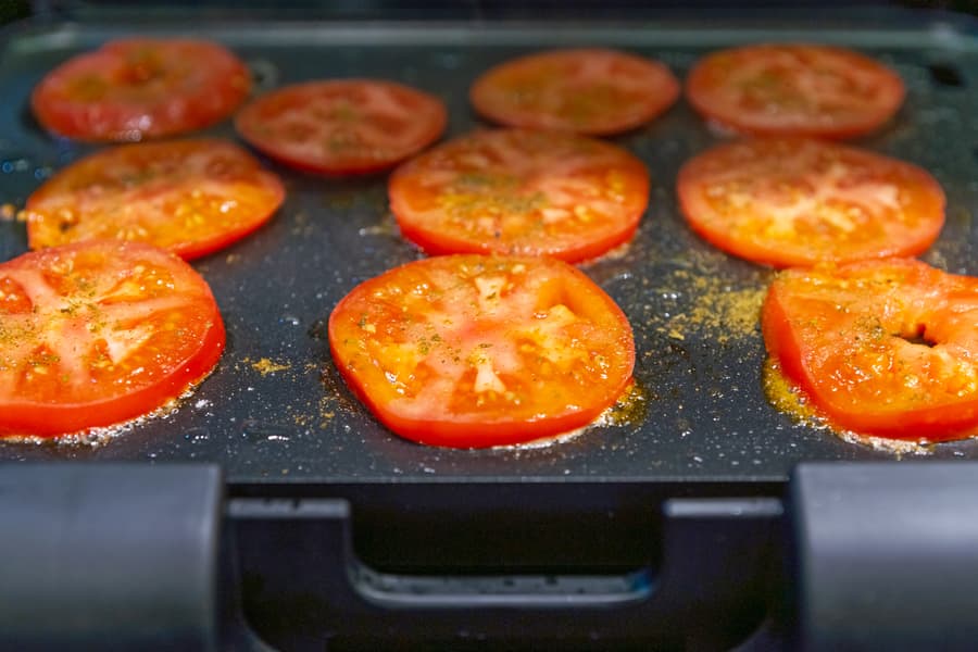 Разогрели гриль, выставив ручку регулятора на 3. Смазали панель растительным маслом и выложили первую партию — помидоры.