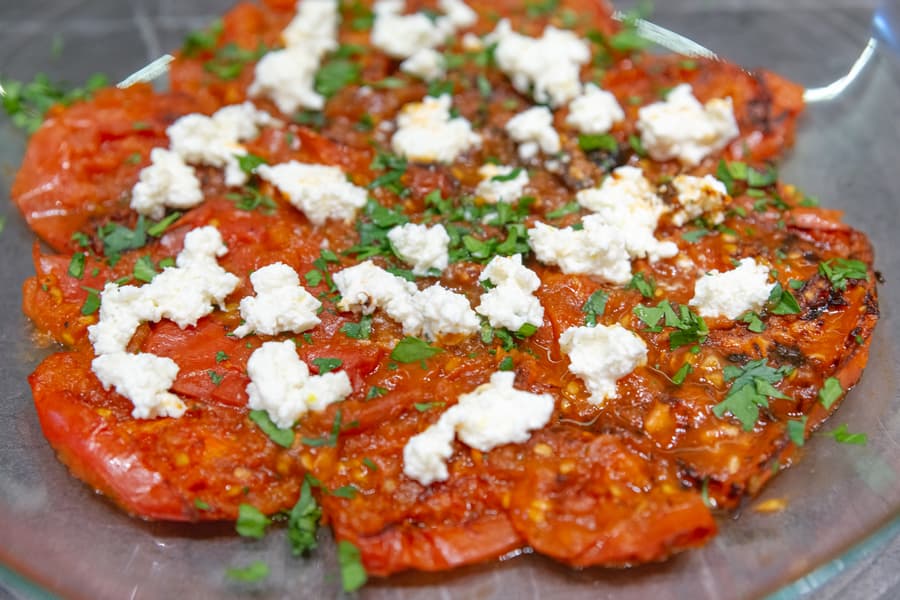 Потом сняли с гриля и разместили на дне плоского блюда. Адыгейский сыр размяли вилкой и смешали с измельченным чесноком. Выложили часть сыра на помидоры, присыпали солью, специями, мелко нарезанной кинзой, отставили в сторону и вернулись к грилю.