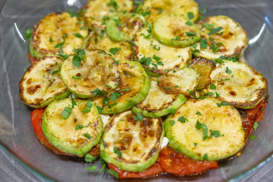 Пока кабачки запечатывались золотистой корочкой, баклажаны вынули из подсоленной воды, промыли и обсушили на бумажном полотенце. Для кабачков потребовалось 10 минут. Их мы поместили вторым слоем, на помидоры, присыпав зеленью.