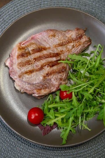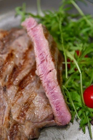 Всего на прожарку понадобилось 5,5 минут. Сняли стейк с гриля, выложили на тарелку и оставили немного отдохнуть под фольгой. Желаемая степень прожарки достигнута.
