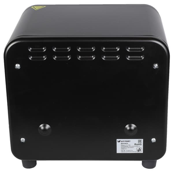 На задней панели также имеются прорези для отвода нагретого воздуха. В нижней части размещена наклейка с технической информацией об изделии. Справа и слева — два небольших выступа, противодействующих установке мини-печи вплотную к стене или другим поверхностям.