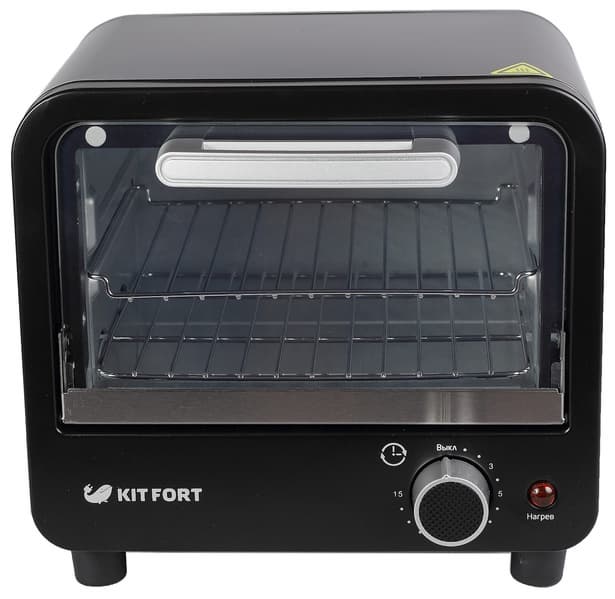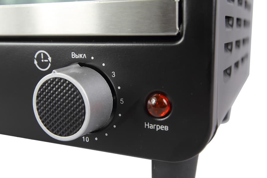 Все управление мини-печью Kitfort KT-1709 заключается в установке таймера на требуемое для пользователя время от нескольких до 15 минут. Круглый регулятор вращается с определенным натяжением. Сбоку от него нанесены отметки в виде точек и цифр, обозначающих количество минут. Вращать ручку таймера следует в привычном направлении — по часовой стрелке для увеличения и против часовой стрелки для уменьшения времени работы. Во время работы таймер издает специфическое, знакомое, пожалуй, всем негромкое тиканье. По завершении работы раздается громкий звонок. Его тоже трудно с чем-либо перепутать.