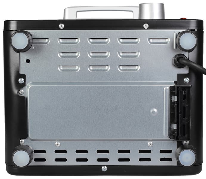 Со стороны дна мы видим те же вездесущие вентиляционные отверстия и четыре ножки высотой 2,5 см. На поверхности ножек закреплены прорезиненные вставки, предохраняющие печь от скольжения по поверхности стола. Здесь же закреплен кабель электропитания. Шнур толстый, местом для его хранения печь не оснащена. Длина кабеля невелика, но представляется нам вполне достаточной — чуть меньше метра.