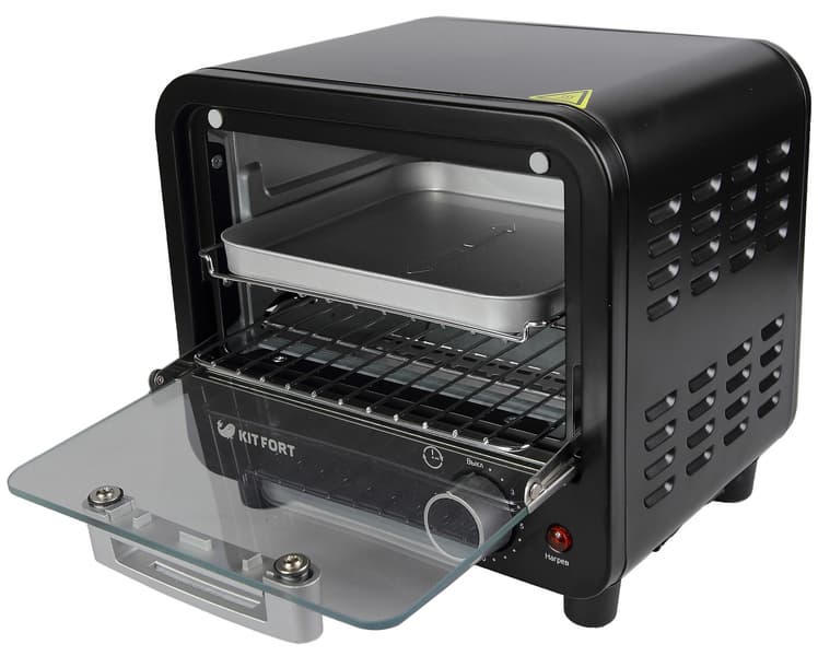 Мини-печь Kitfort KT-1709 идеально подойдет для одного-двух человек, которые очень любят поджаренный хлеб с расплавленным сыром. Либо в случае, когда человеку не требуется большая духовка, чтобы готовить разнообразные блюда. Прибор компактный, занимает очень мало места. Благодаря кварцевым нагревателям, печь быстро разогревается и столь же быстро поджаривает тосты, горячие бутерброды и сэндвичи. Можно в ней приготовить и что-то более существенное, однако это потребует большего количества времени и внимания. В принципе, печь хорошо справляется с поджариванием яичницы, колбасок, рыбного филе, но рассчитывать на качественное приготовление чего-то более сложного не стоит.