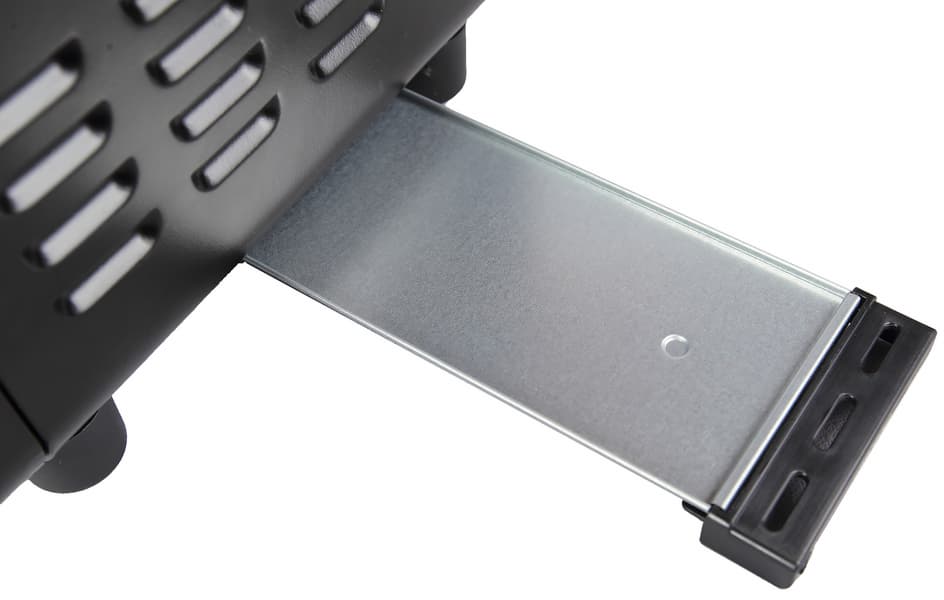 Внизу с правой стороны закреплен выдвижной поддон для сбора крошек. Изготовлен из штампованного листа железа, часть, за которую нужно тянуть — из пластика. Поддон небольшой, его габариты составляют 6,2×17 см. Выдвигается и задвигается легко, долго искать место его установки не нужно — оно сдвинуто от центра в сторону задней панели.