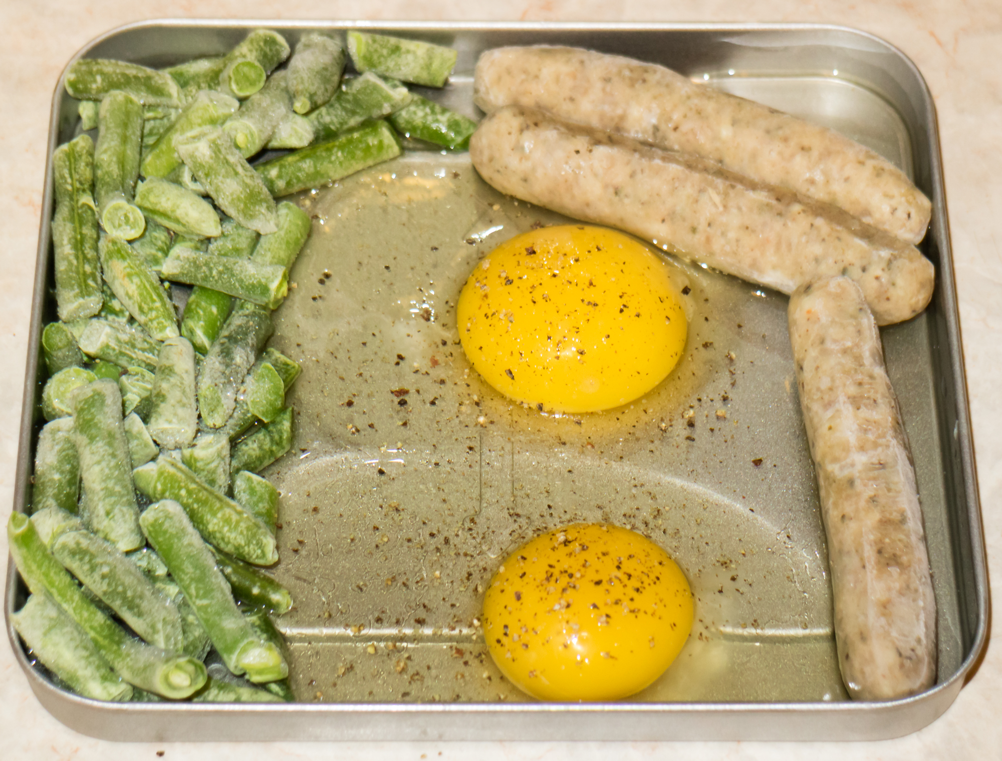 Далее мы перешли к более серьезным, чем бутерброды, блюдам. Смазали поверхность противня и боковые стороны растительным маслом. Для этого нам понадобилась буквально чайная ложка масла. С одной стороны положили немного замороженной стручковой фасоли, с другой — тонкие свиные колбаски, по центру разбили два яйца. Присолили и поперчили яйца.