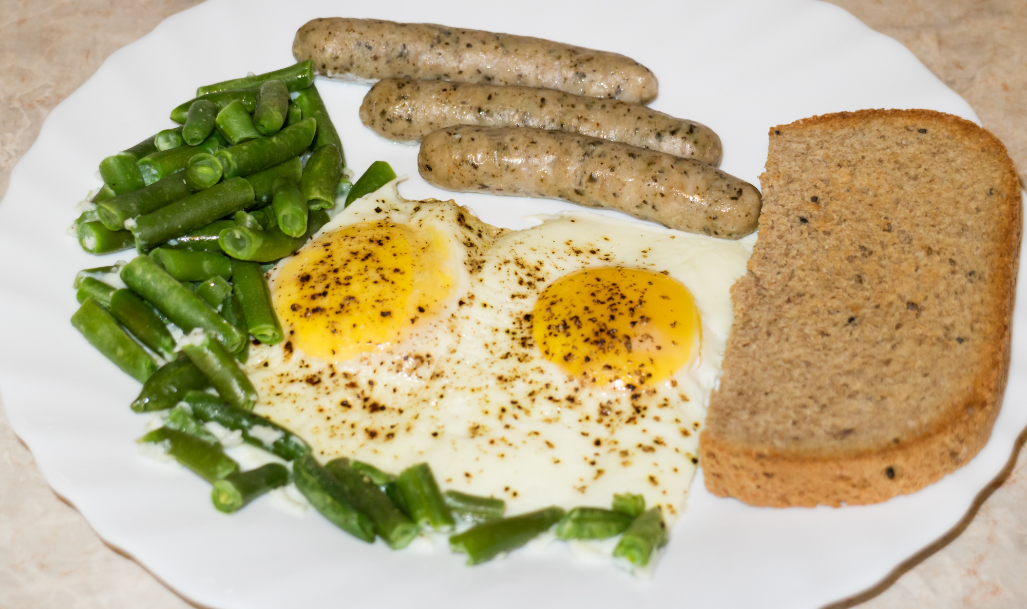 Колбаски прогрелись и слегка поджарились, яйца полностью, включая желток, приготовились, а вот стручковой фасоли времени не хватило — продукт был жестковатым. К яйцам и колбаскам следовало бы добавить предварительно бланшированную фасоль, тогда бы мы достигли того результата, к которому стремились — приготовили сытный и сбалансированный завтрак.