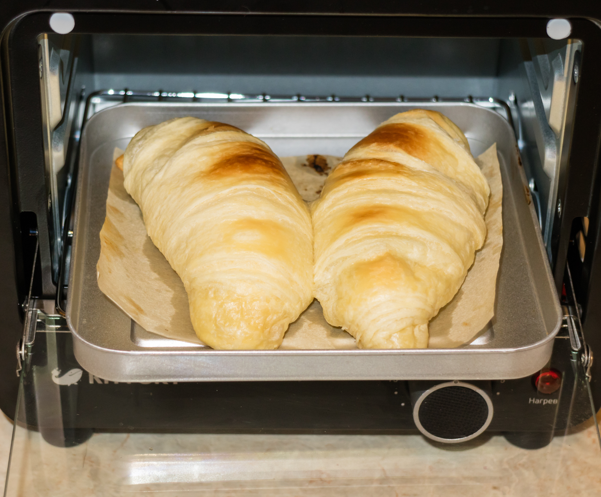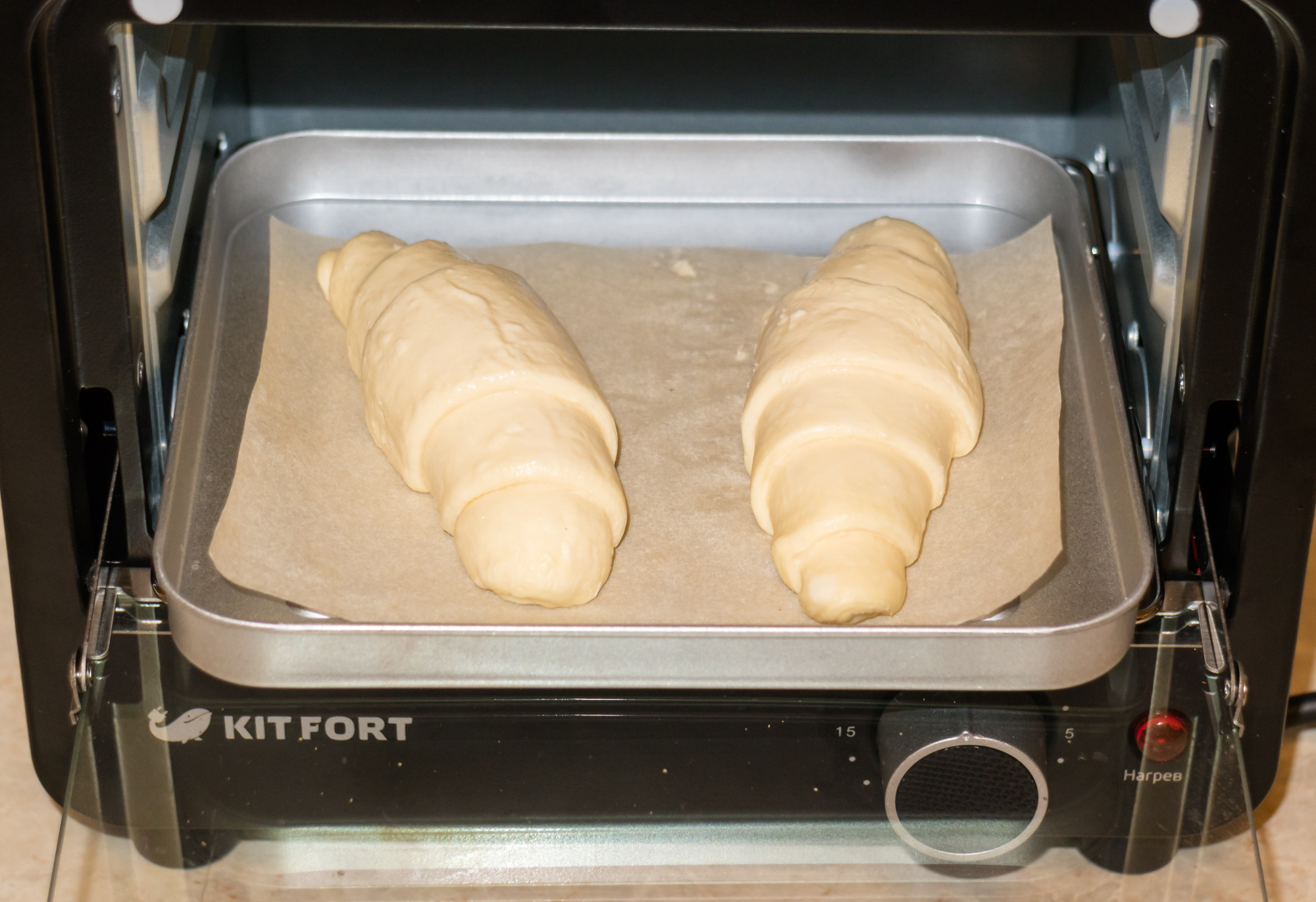Установили на нижнюю несъемную решетку и выкрутили ручку таймера до максимума. Время пошло, таймер затикал. Через 10 минут круассаны сильно увеличились в размерах, однако поверхность их лишь слегка подрумянилась.