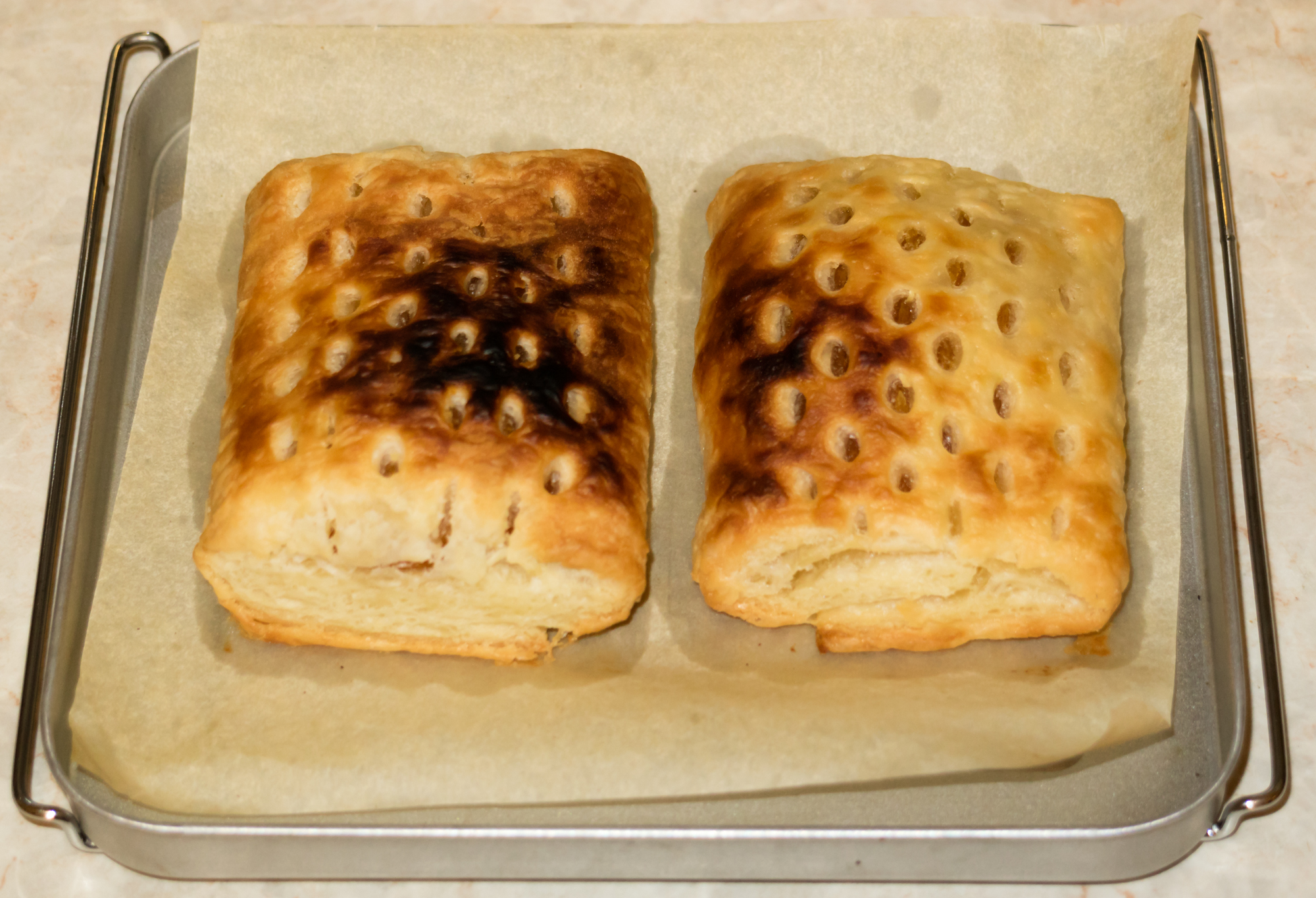 По завершении в общей сложности 20 минут выпечки слойки подрумянились сверху и снизу, увеличились в размерах, однако остались тяжелыми. Поверхность поджарена неравномерно. При пробе стало ясно, что внутри они слегка сыроваты.