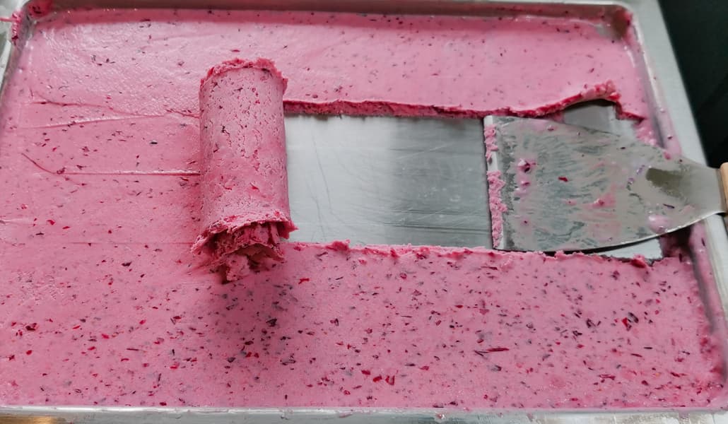 Если смесь уже замерзла, но скатываться в рулеты не хочет, можно снять ее шпателем, измельчить еще раз, при необходимости добавить сгущенки или фруктов и снова распределить для замораживания.
