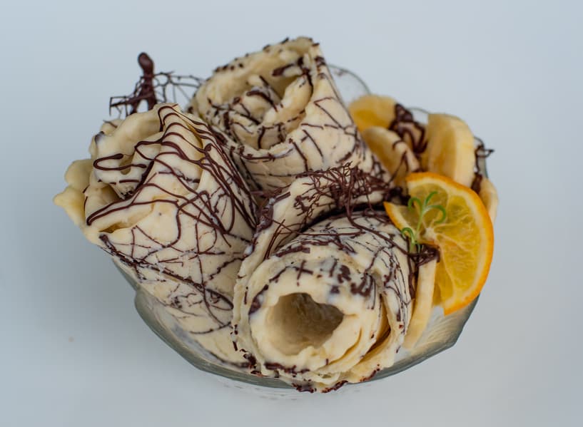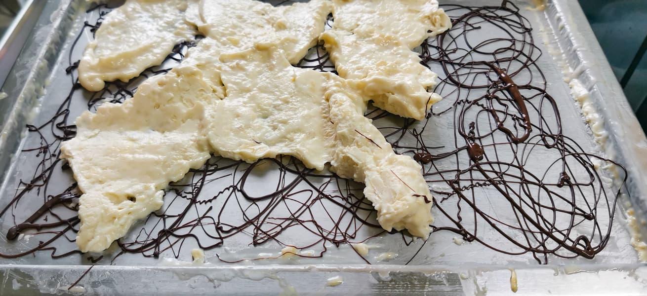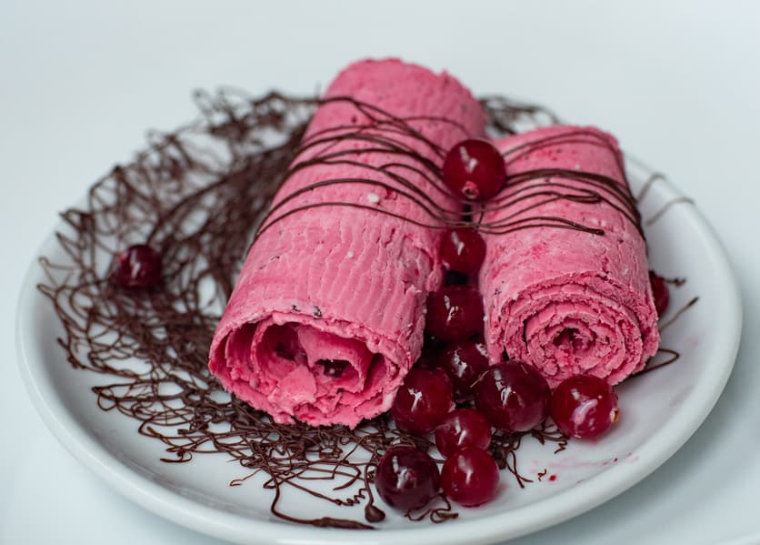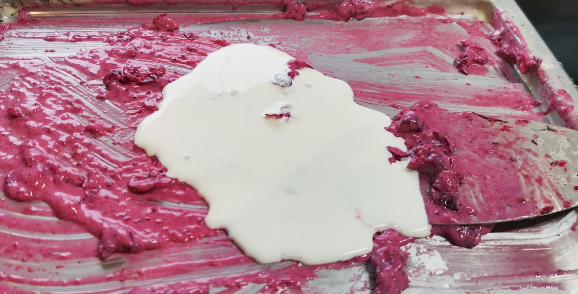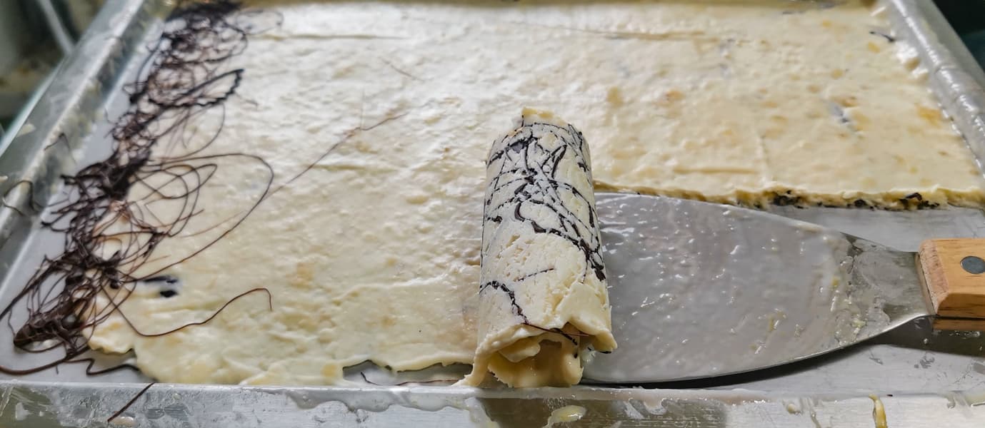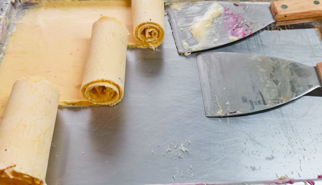 Для того, чтобы мороженое лучше скатывалось в рулетики, а не отставало от поверхности пластами, нужно добавлять достаточное количество сгущенного молока.