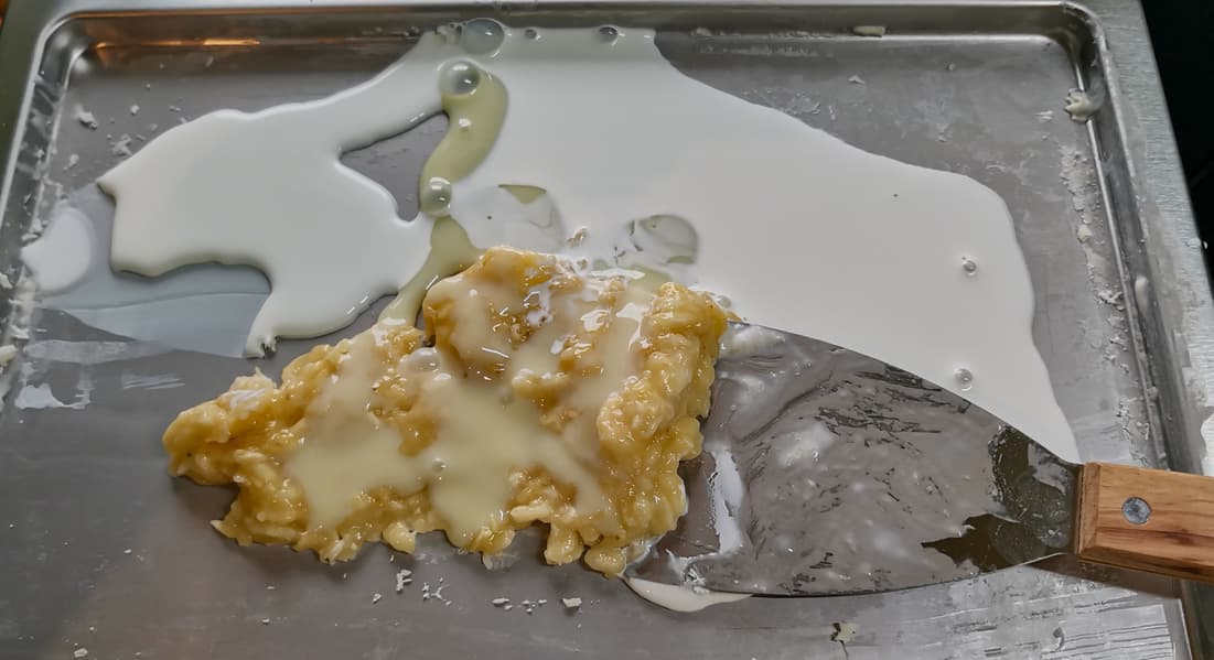 После того, как смесь достаточно перемешали, мы распределили ее ровным слоем, подождали 2-3 минуты и скатали из нее роллы.