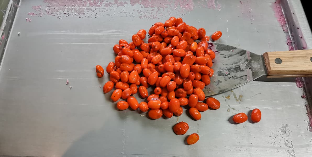 Ягоды облепихи высыпали на рабочую поверхность и раздавили шпателем.