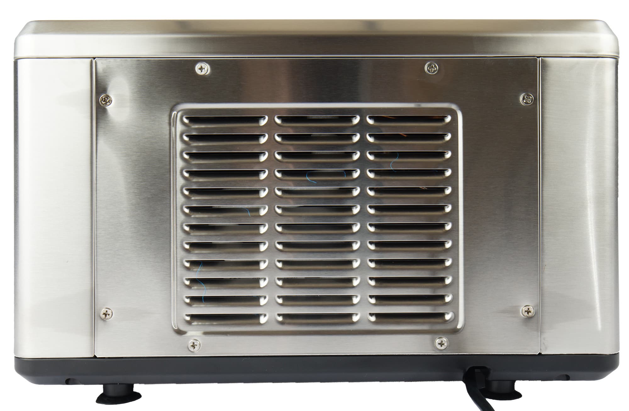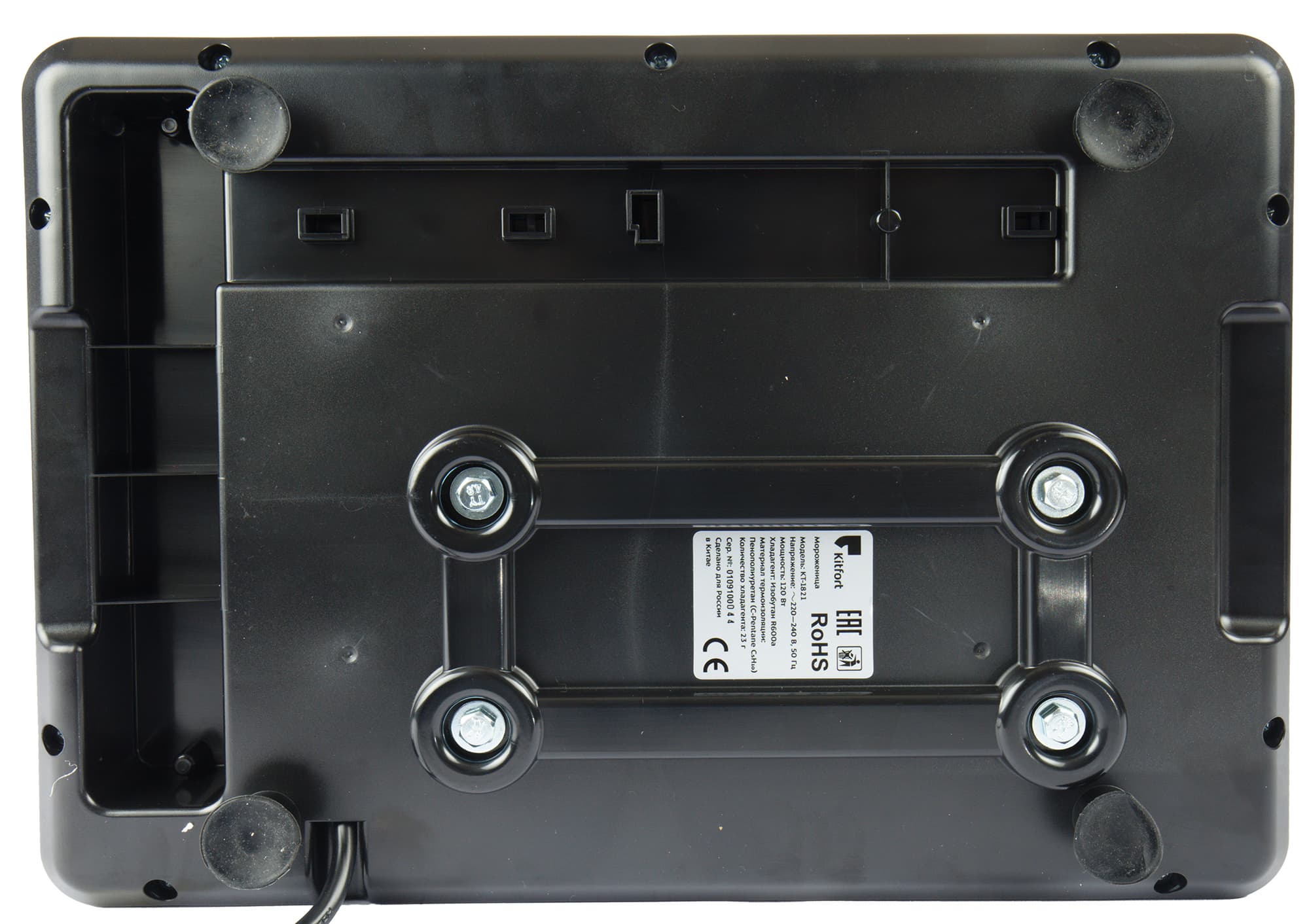 Наклейка с техническими характеристиками находится на нижней поверхности. Мороженица стоит на четырех прорезиненных ножках, обеспечивающих снизу необходимый вентзазор.