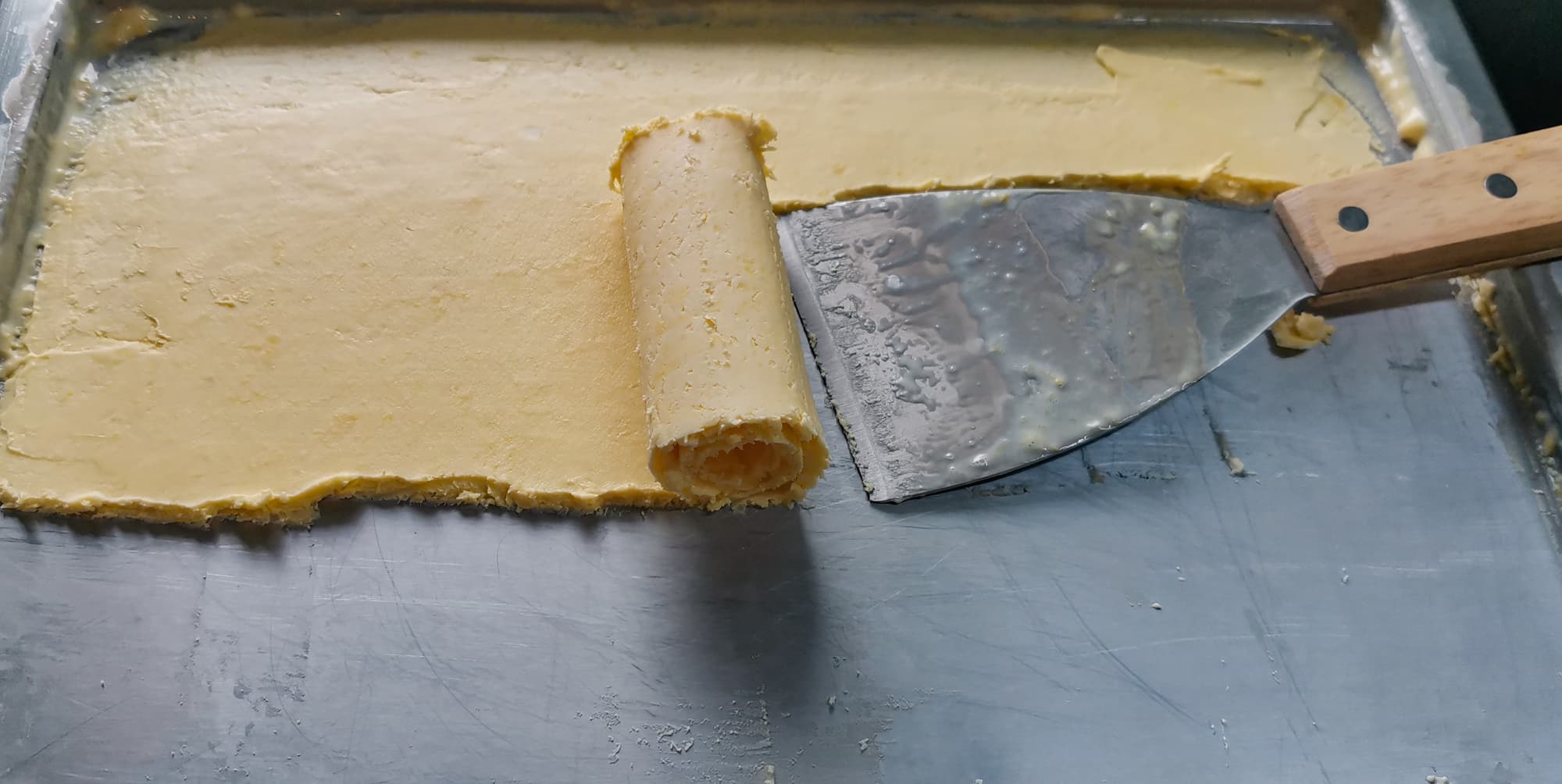 Аккуратно поддели шпателем и скатали смесь в роллы.