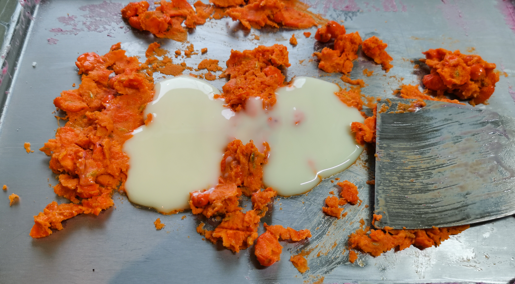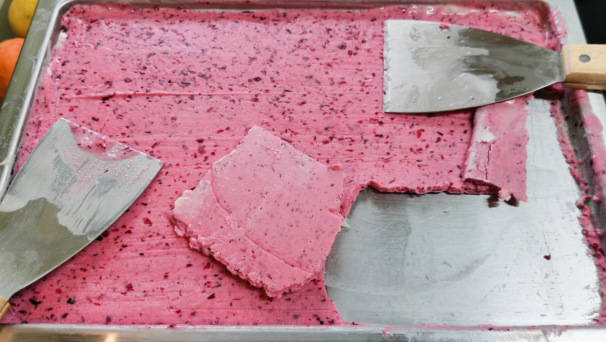 Быстро, пока сливки не заморозились, измельчили манго шпателями, постоянно перемешивая смесь. На перемешивание и выравнивание смеси у нас ушло около 3 минут.