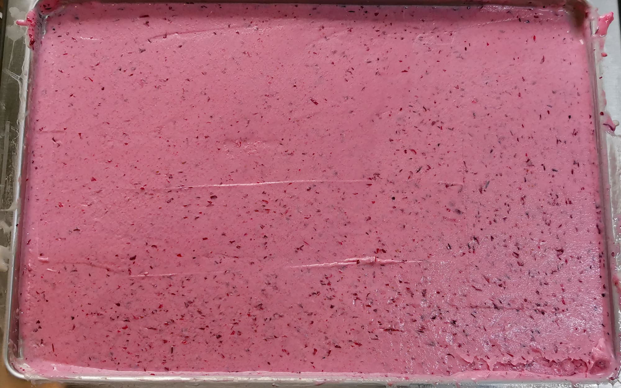 Когда смесь немного подморозилась, добавили 30%-ных сливок, перемешали до однородности, распределили по поверхности ровным слоем для замораживания.